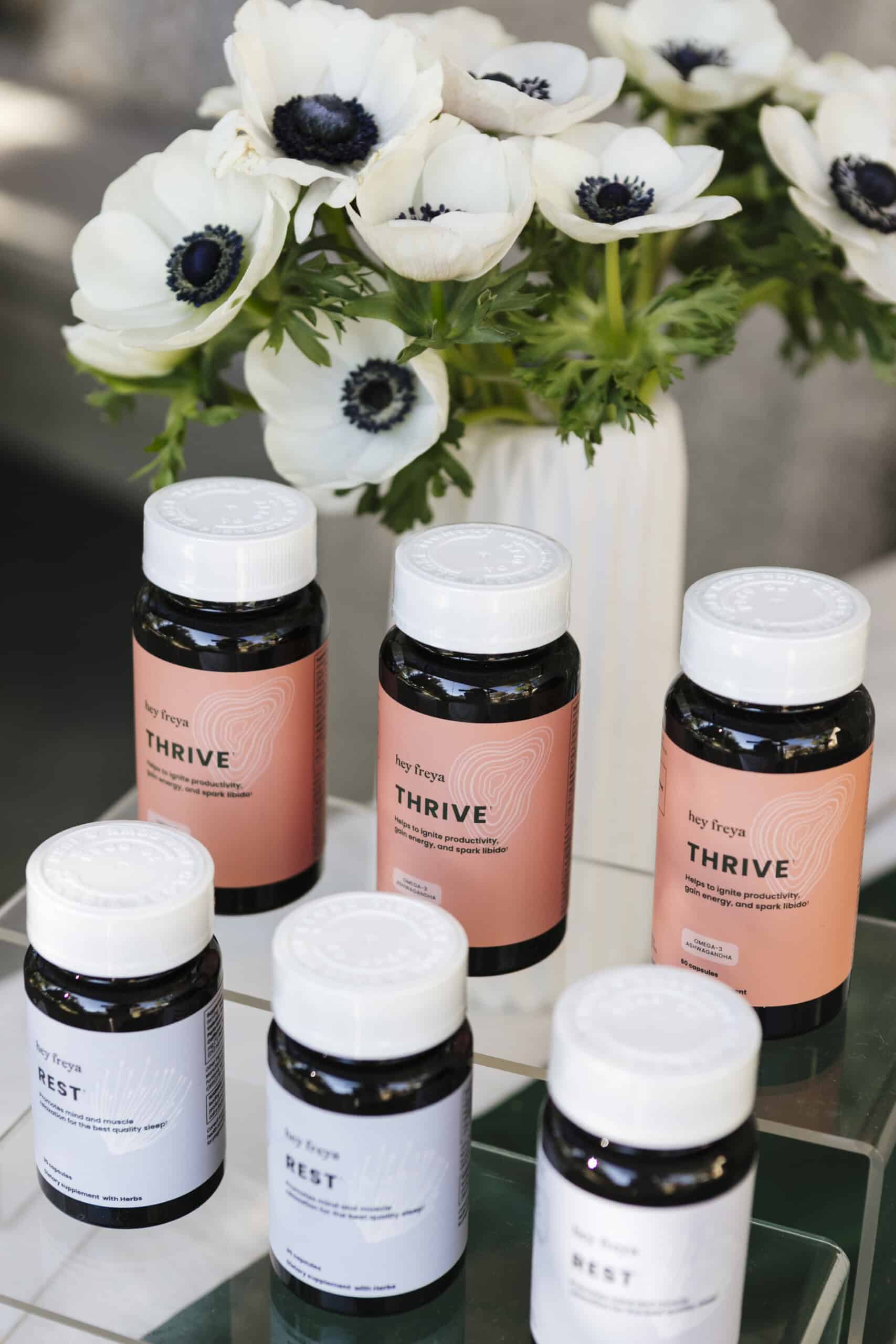 - Two of Hey Freya's signature products: Thrive (a Women's Daily + Stress Support) and Rest (Herbal Sleep Support).