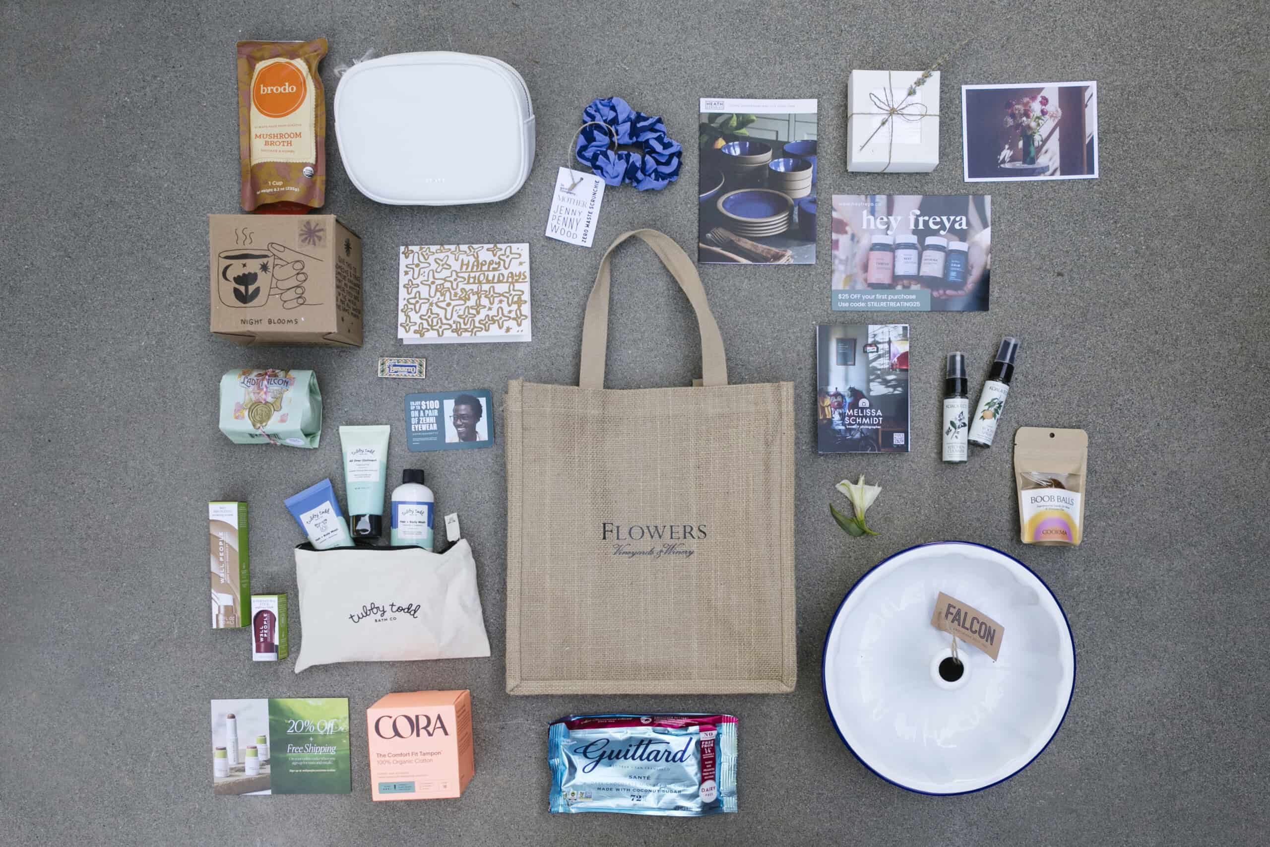 - The inside of our Flowers gift bag was stuffed with goodies by STATE Bags, People I've Loved, Well People, Cookma, Falcon Enamelware, Lady Falcon Coffee Club, Jenny Pennywood, Guittard, Tubby Todd, Brodo, Koala Eco, Zenni, Cora, Amy's, Heath Ceramics, Hey Freya, and Icarian Photography.