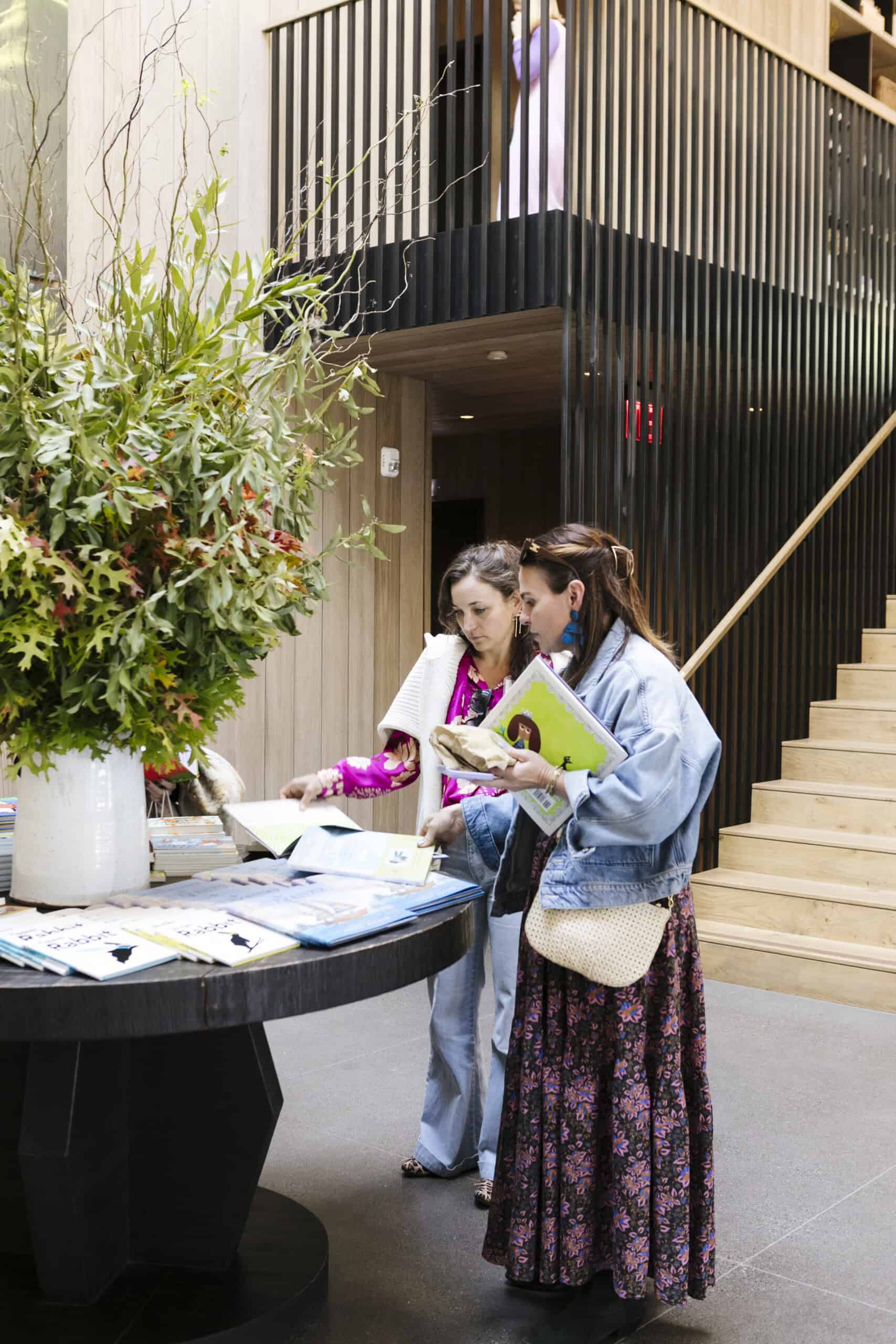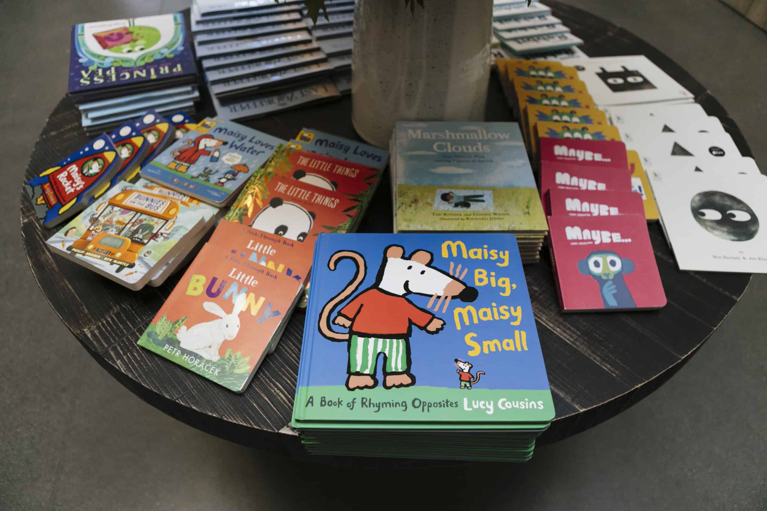 - Aimée Leifer checking out the take-home picture book options from Candlewick Press.