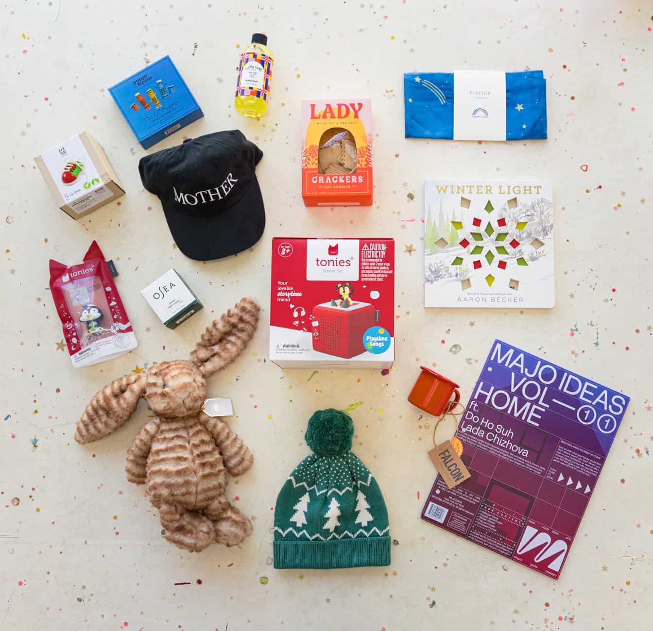 - Inside was a Toniebox and Holiday Songs Tonie, the oh-so-soft Bashful Luxe Bunny Juniper by Jellycat, OSEA's Dream Night Cream for mamas, Tubby Todd's new Holiday Bubble Bath, the Starry Night Play Silk by Sarah's Silks, the Lil' Poppies Trio by Poppy & Pout, an art-centric sticker pack by MAJO, the Tie-Up Shoe toy by PlanToys, a mini espresso mug by Falcon Enamelware, sea salt + olive oil crackers by Lady & Larder, a cozy beanie by Hanna Andersson, the magical Winter Light book by Aaron Becker and Candlewick Press, and a baseball cap by MOTHER.