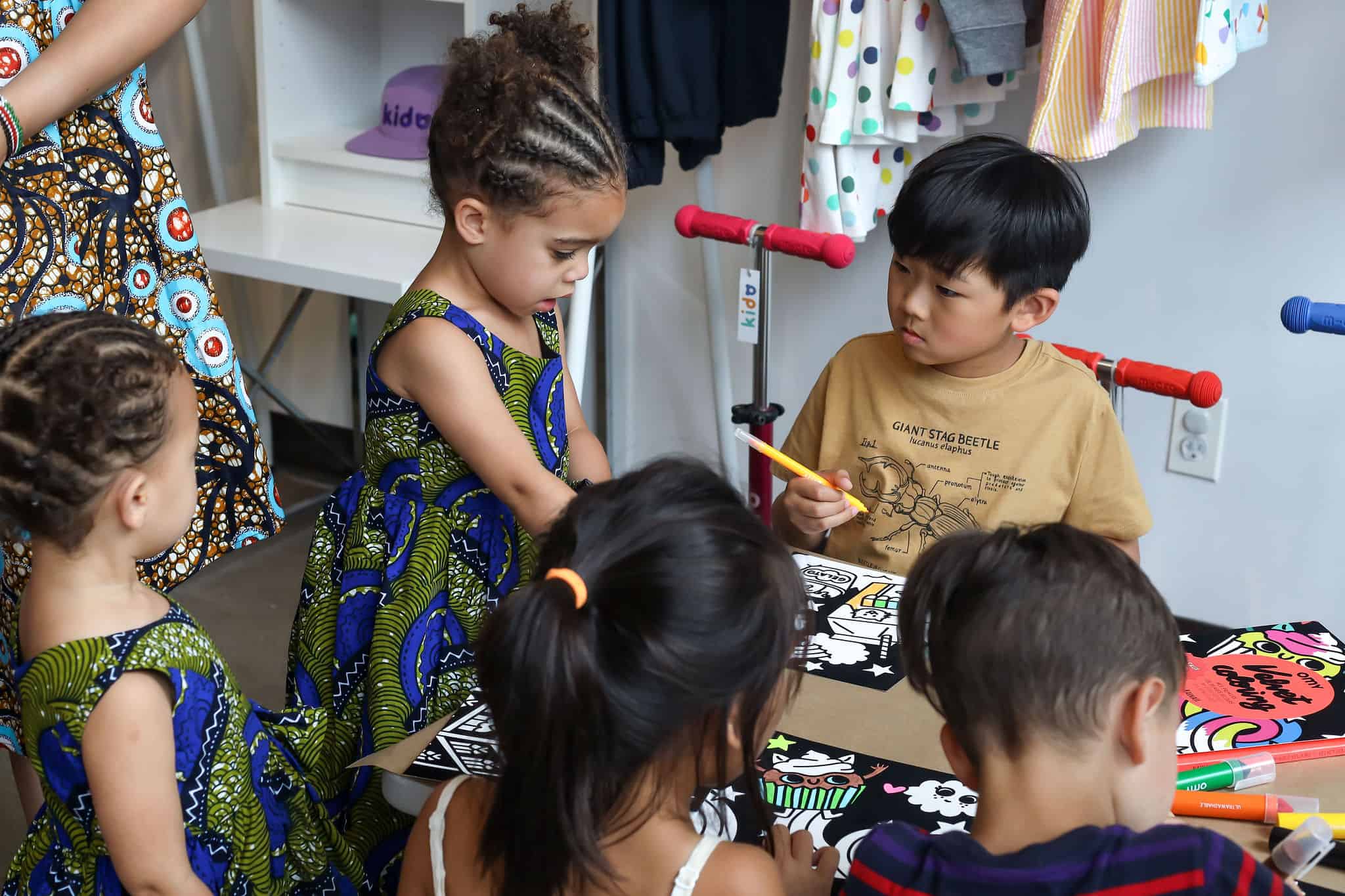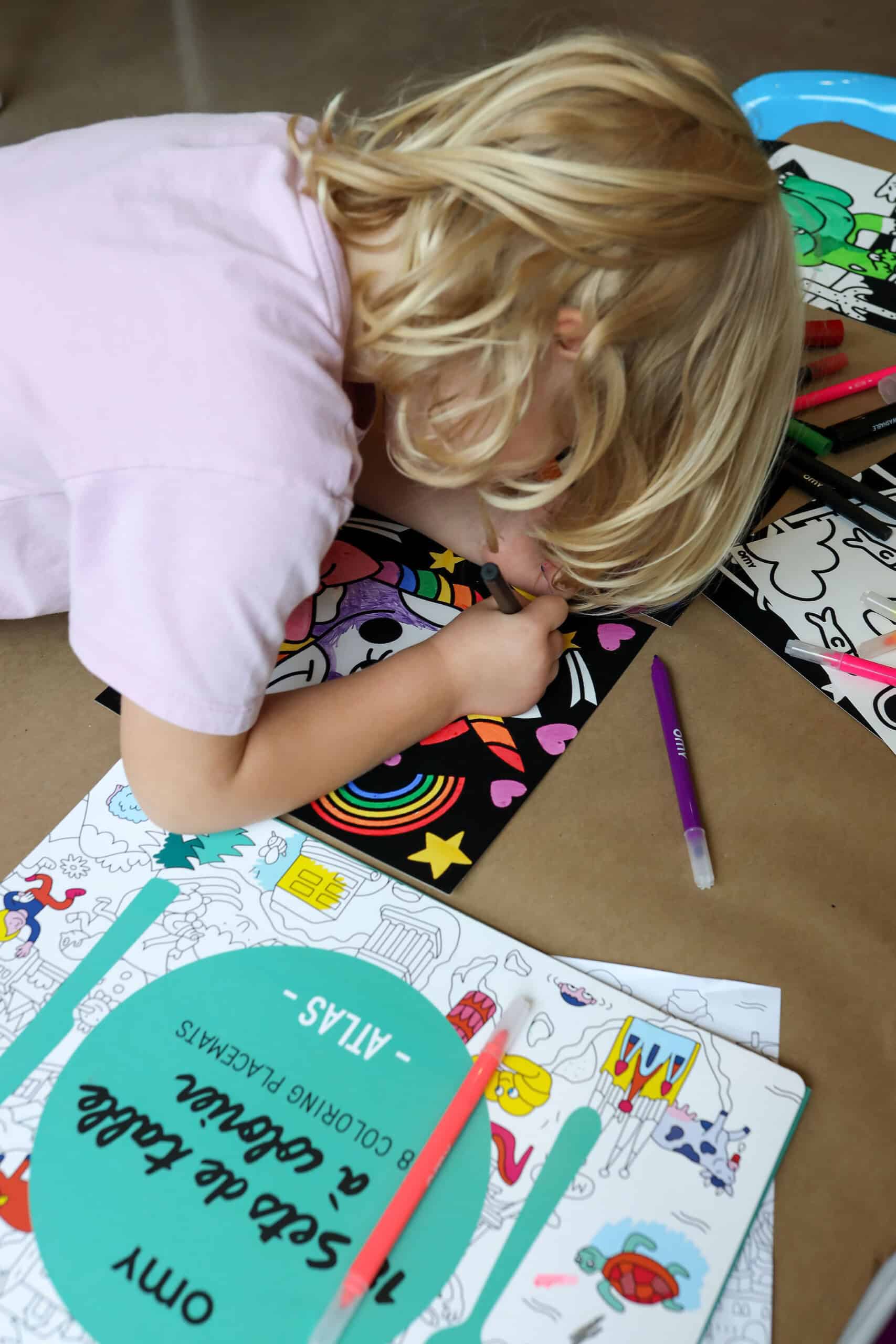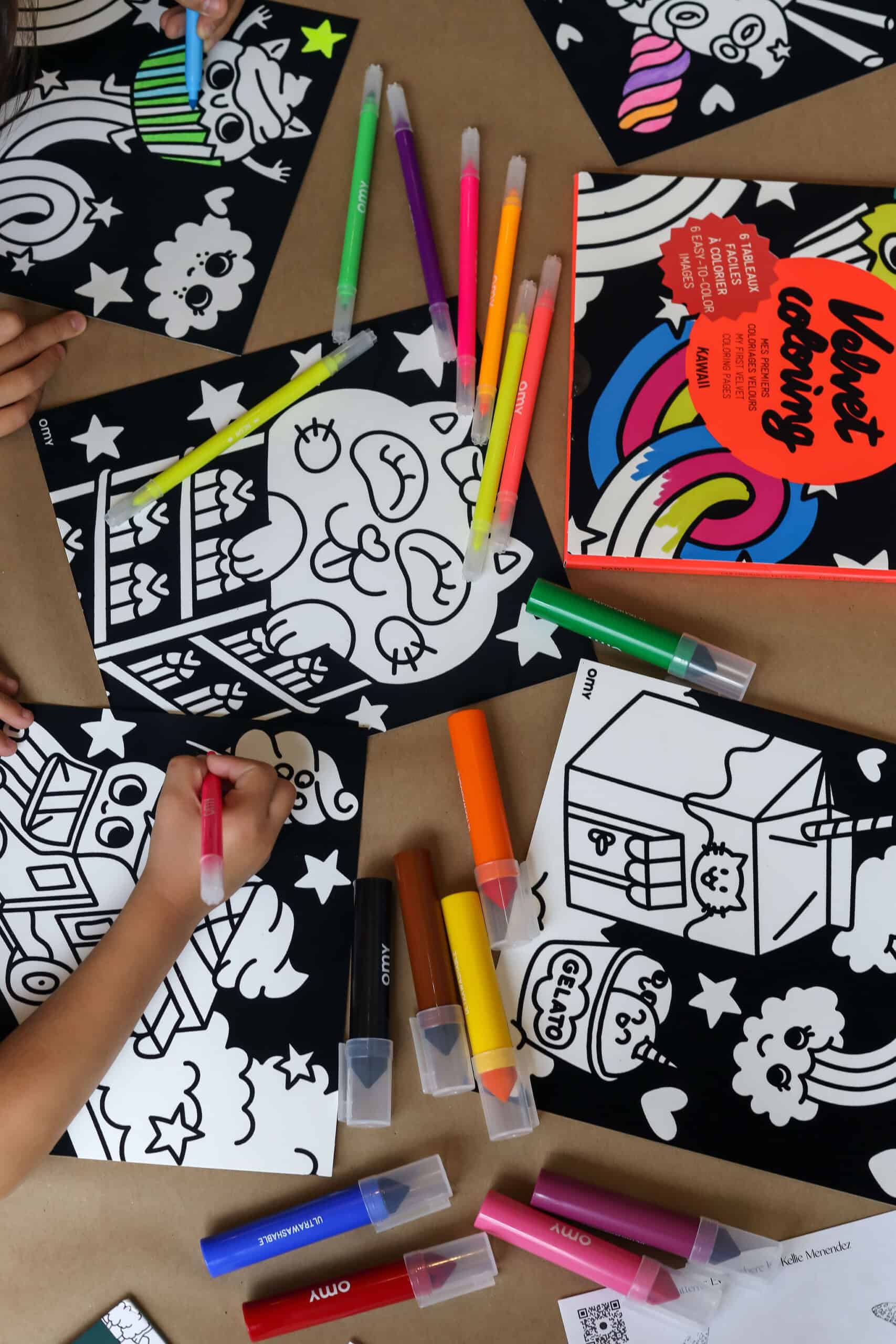 - OMY's velvet coloring sheets kept kids busy and focused.