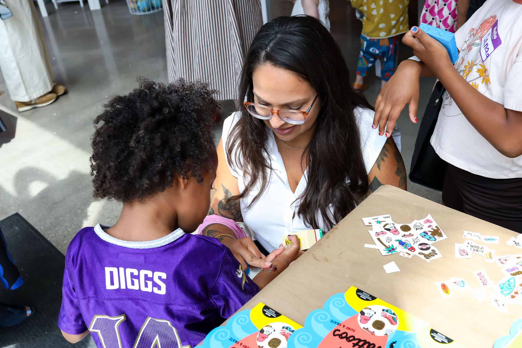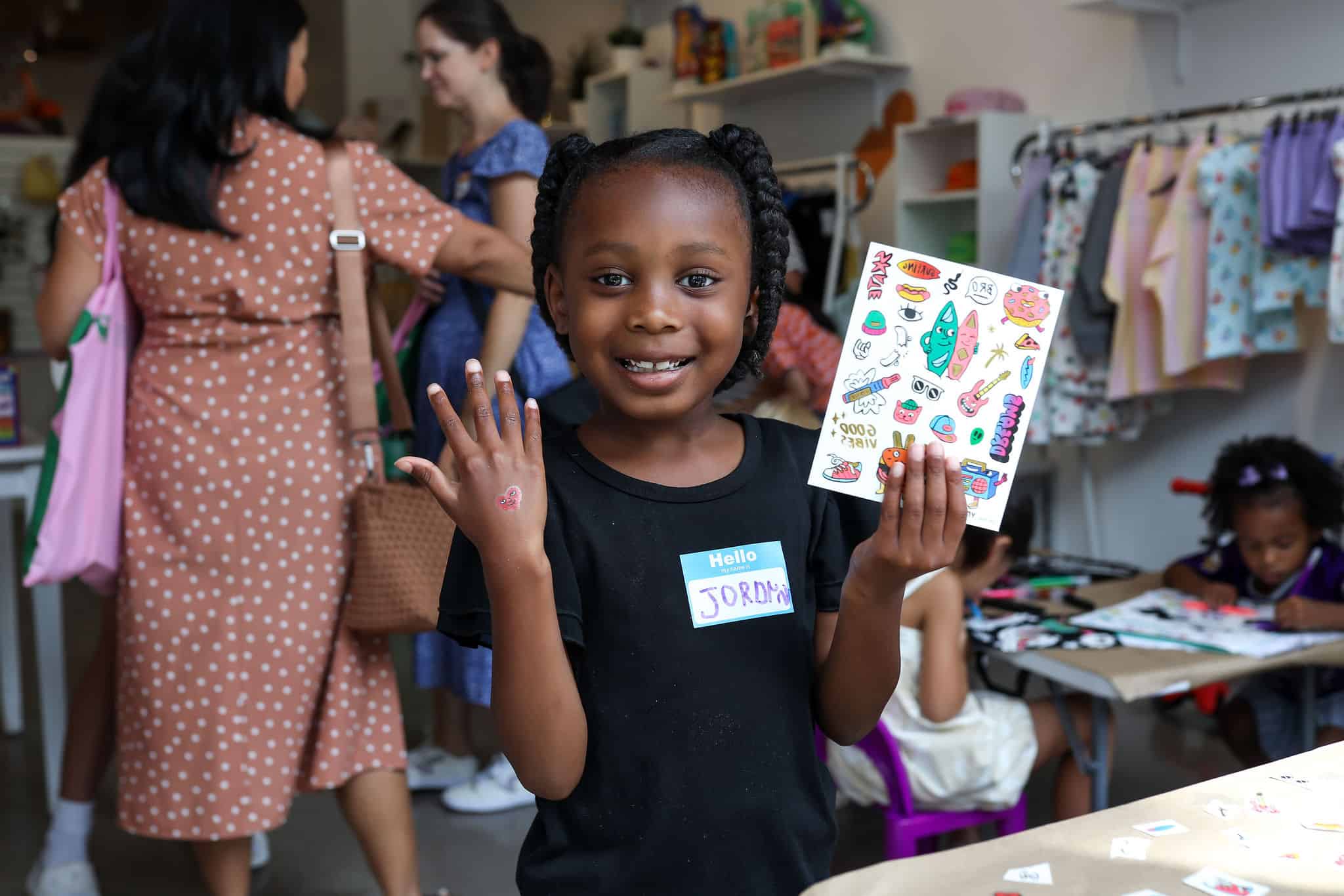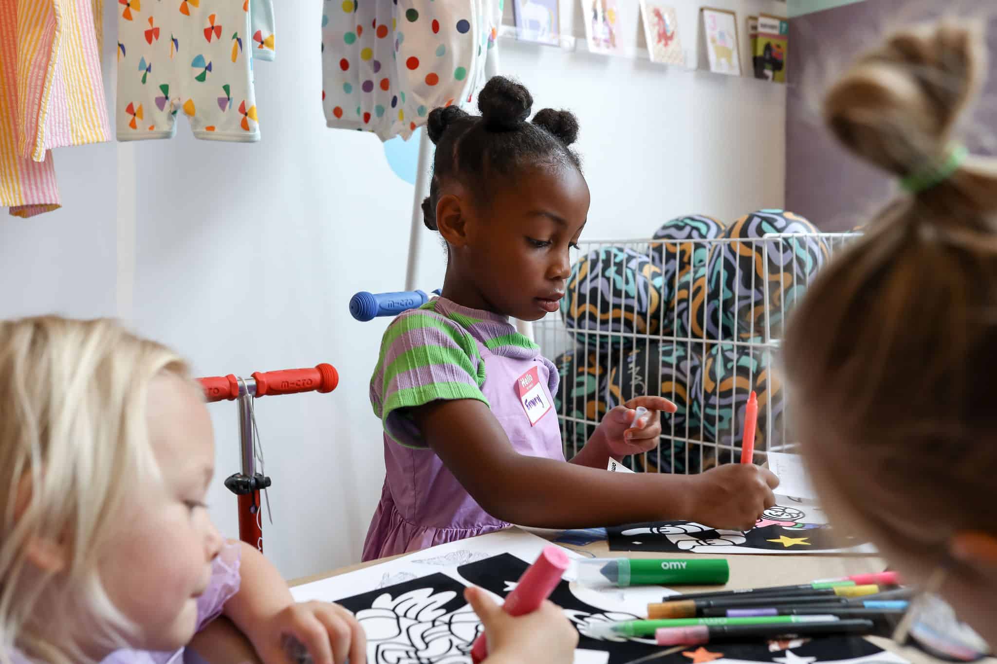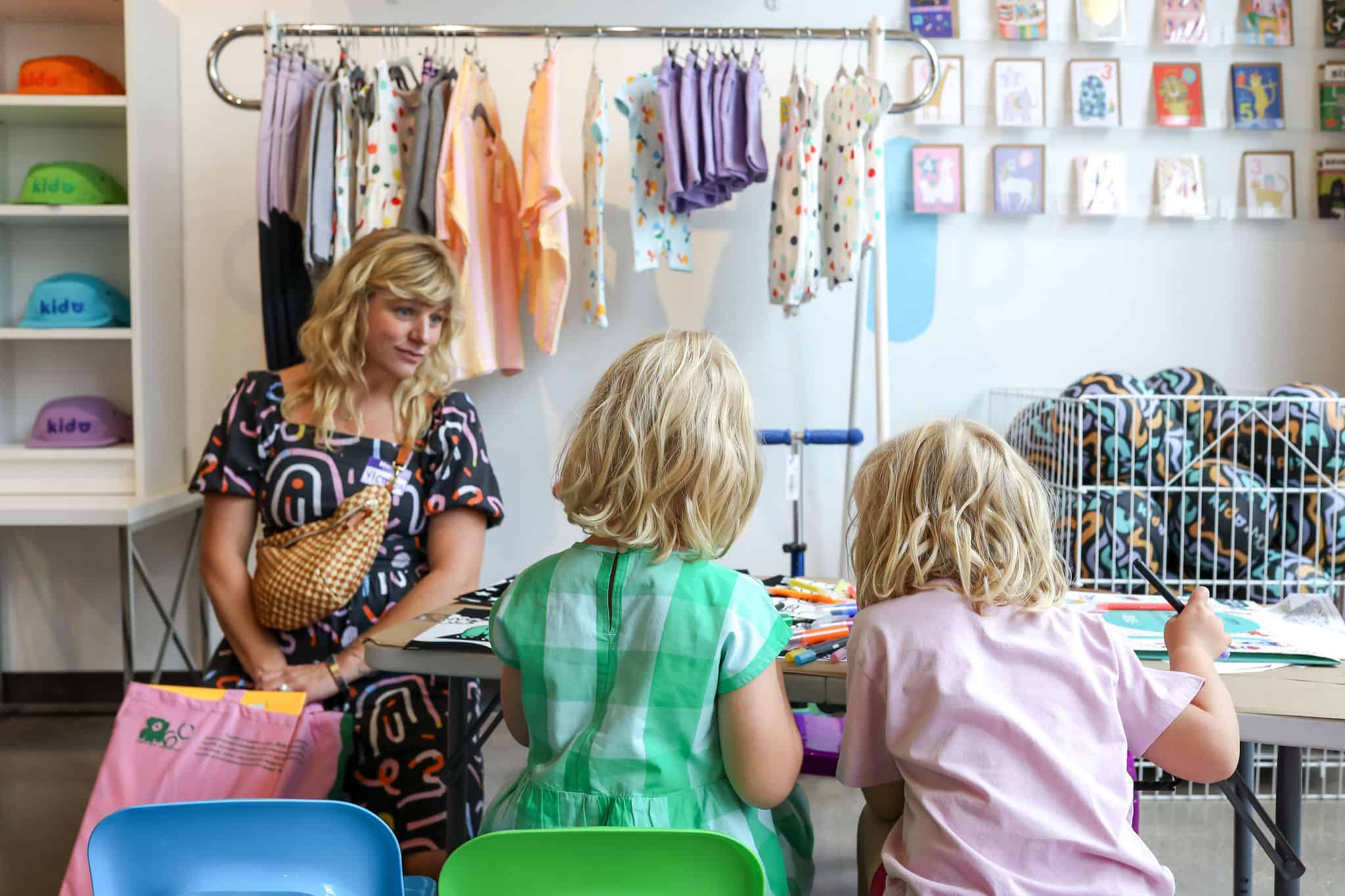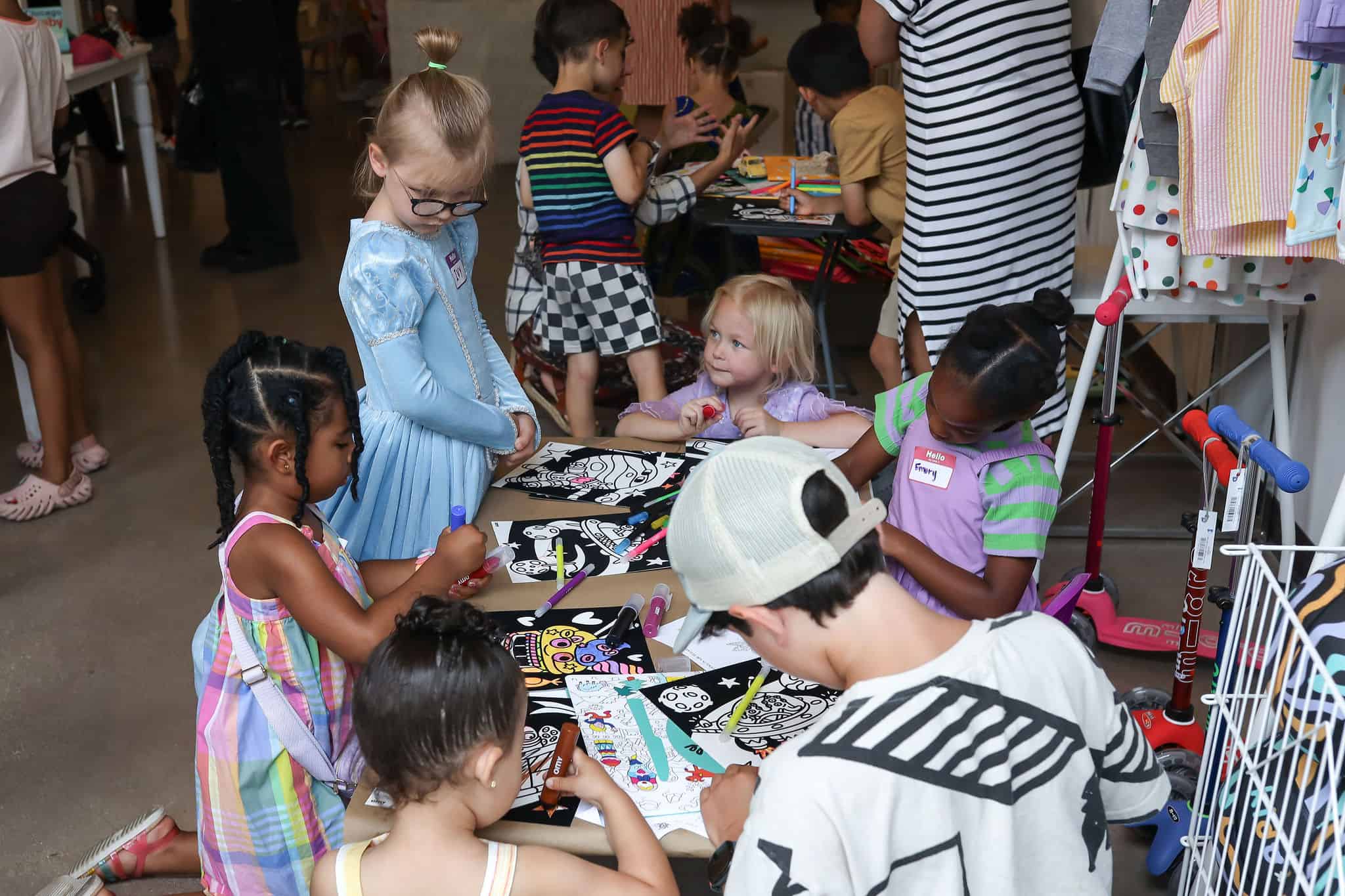 In addition to enjoying interactive book readings with Kellie + Kat, the many kidos (and mamas) in attendance came decked out in patterns and added extra flare with nail stickers and tattoos by OMY, and created mini-masterpieces with OMY‘s velvet coloring sheets and other art projects.