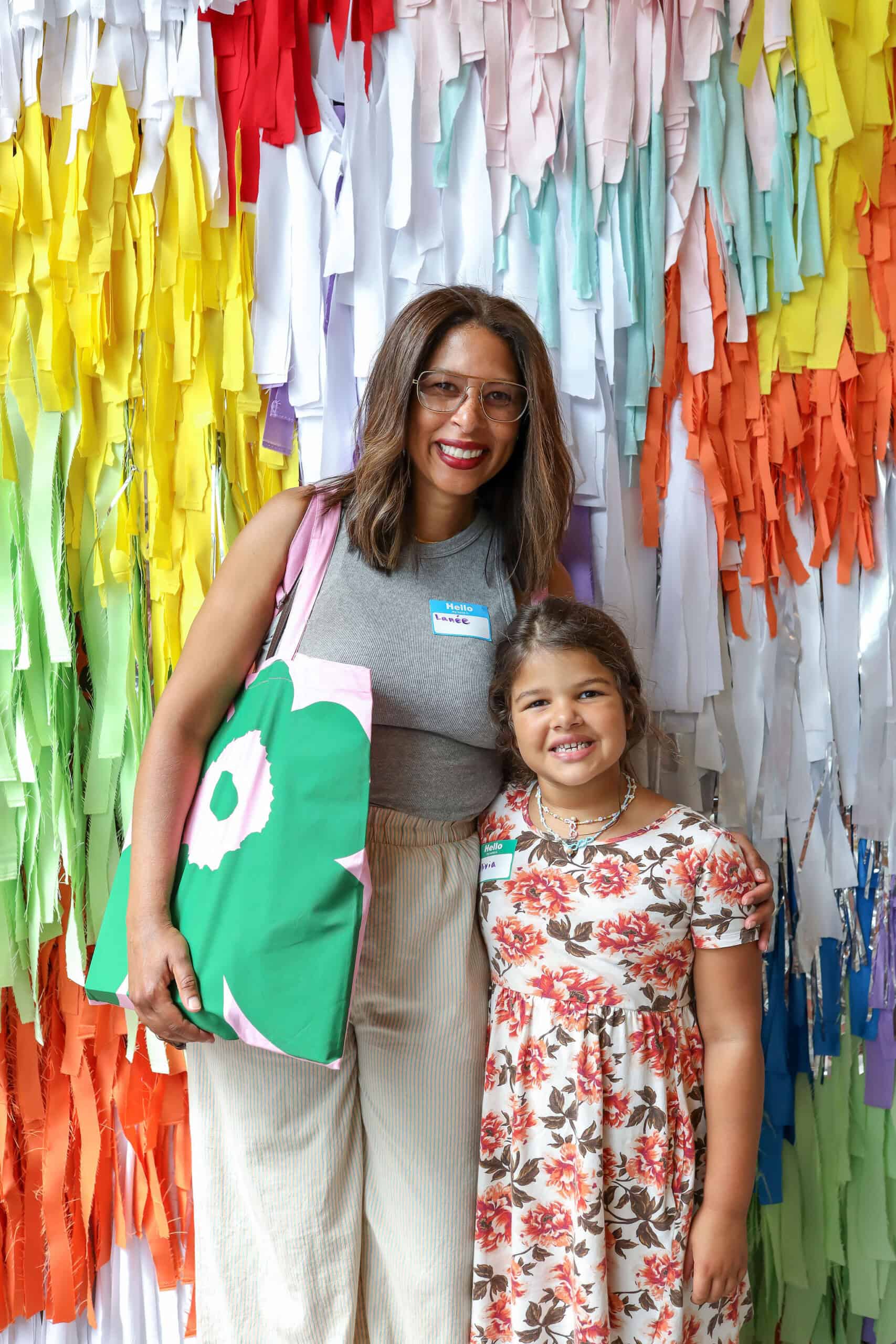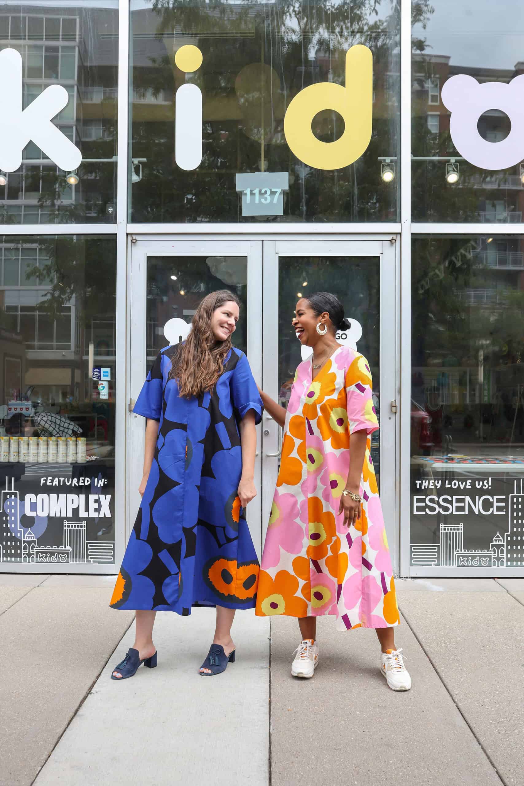 - Co-hosts Katie Hintz-Zambrano and Keewa Nurullah decided to twin with each other—and our Marimekko gift bags—with matching shift dresses in oversized floral patterns.