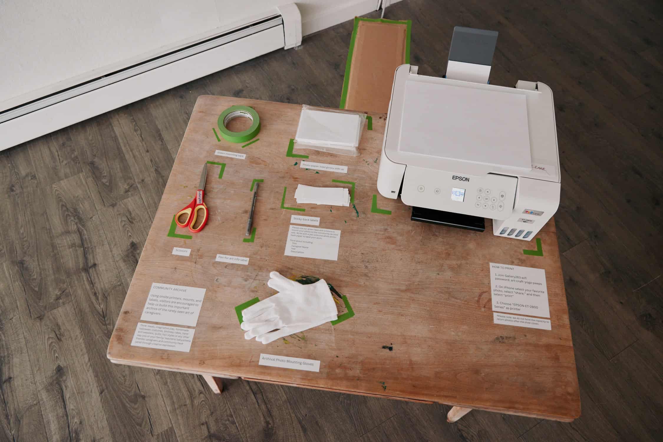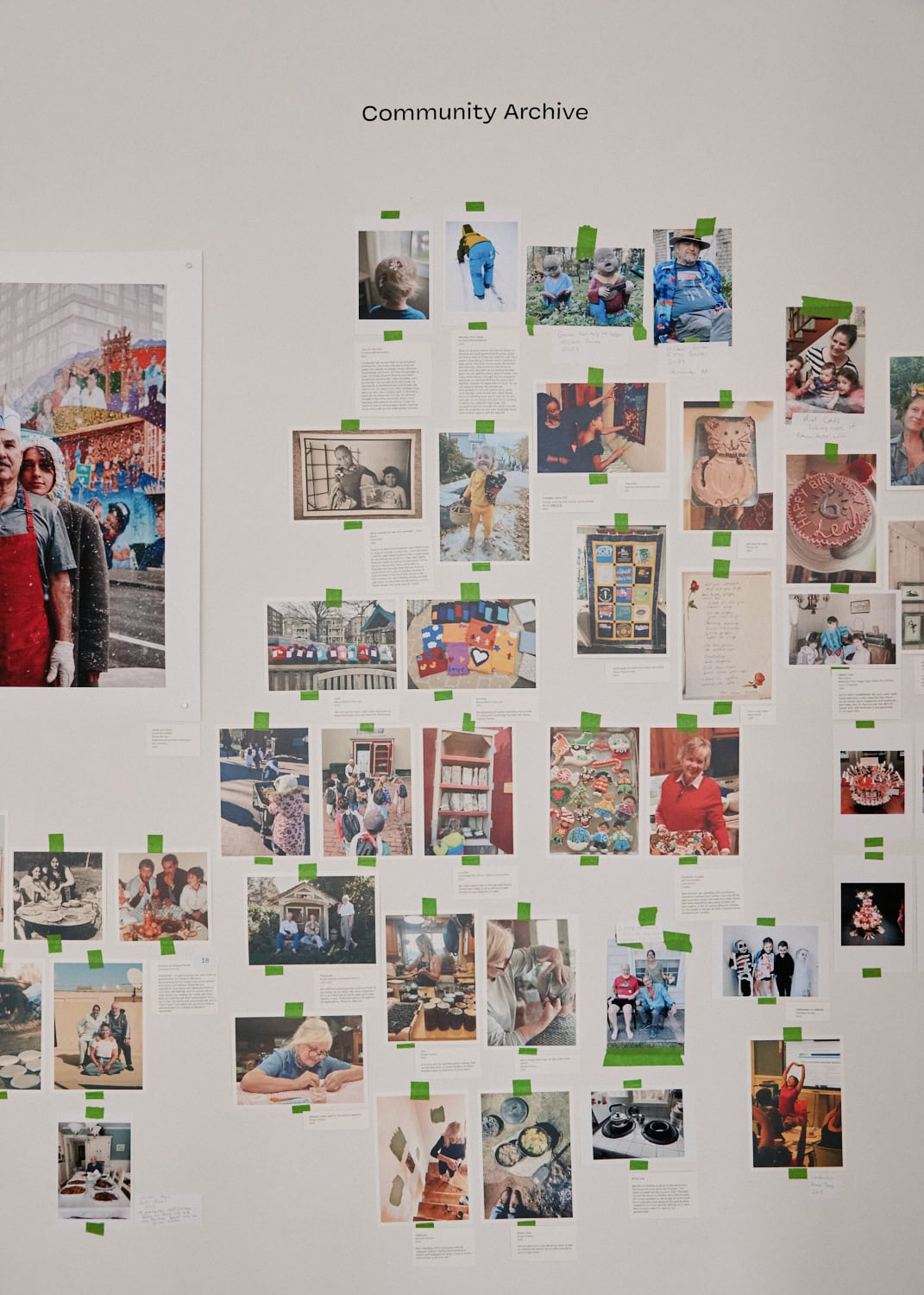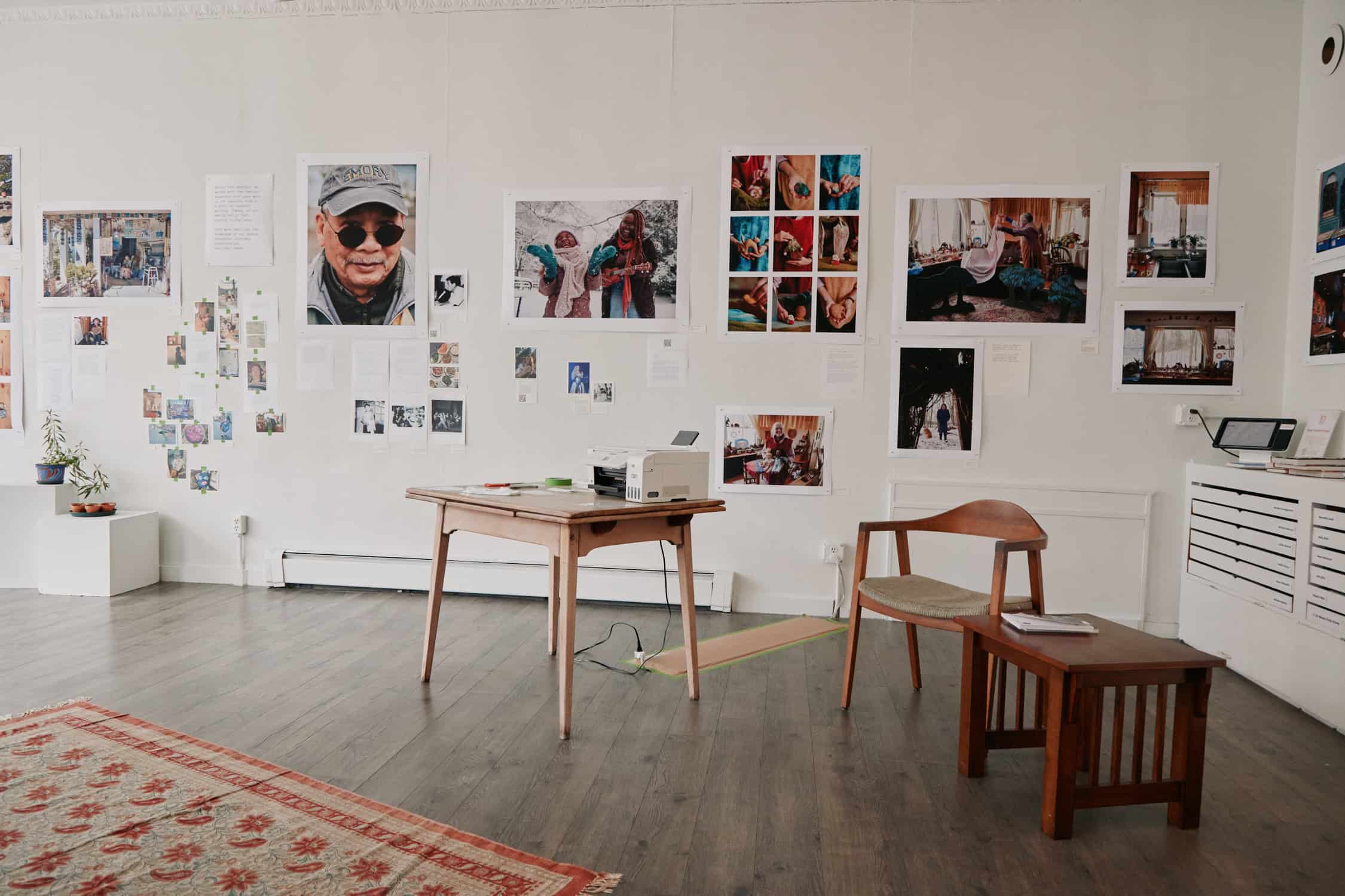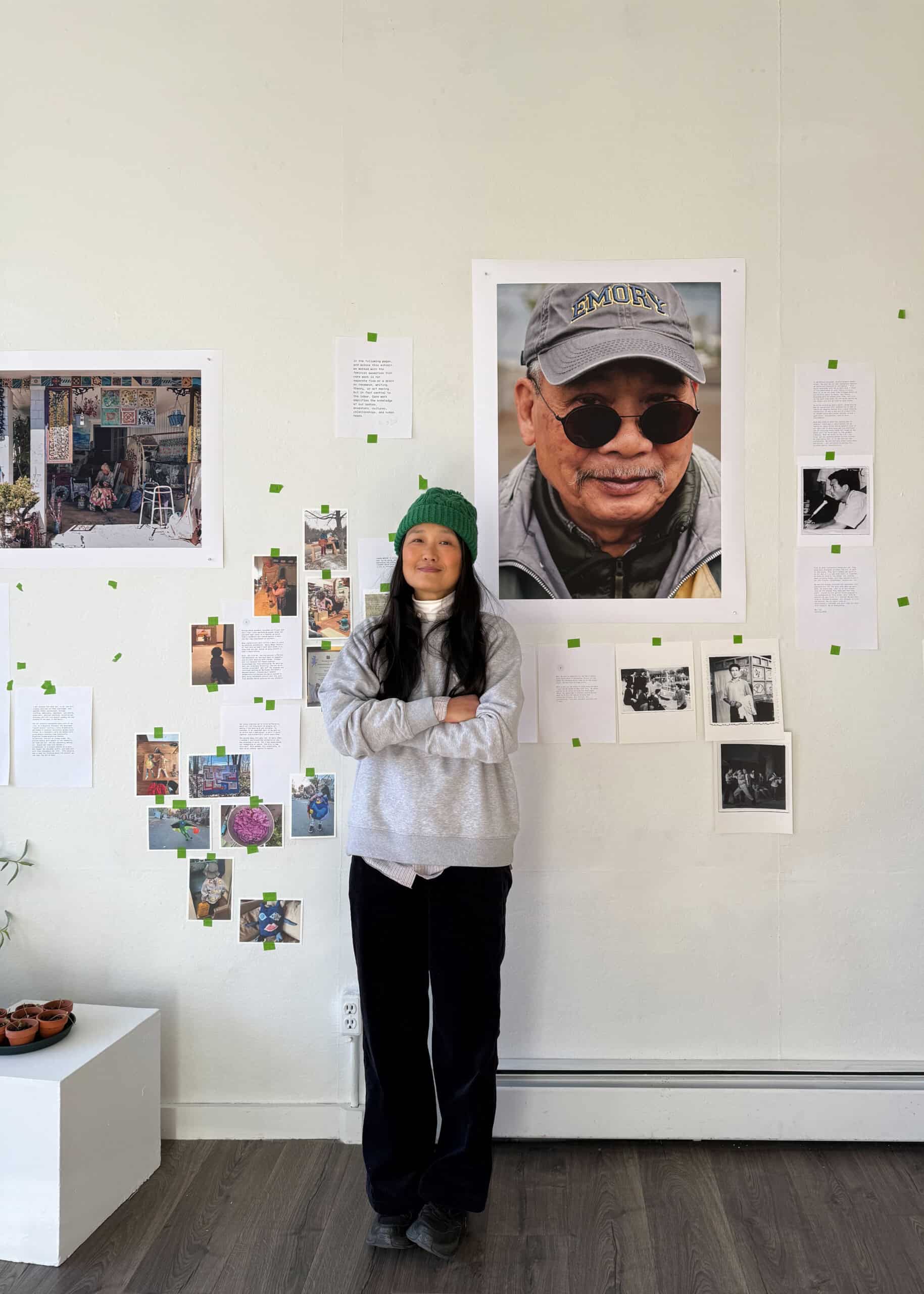 CAMERON + MEI: "To share the art of caregivers, we couldn't take a one-size-fits-all approach. Their work happens in so many different mediums, from food to song, teaching to tending plants, puppet shows and imaginative play, storytelling, upcycling, and repair. We anchored the show by focusing on eight people we were able to photograph, using text and QR codes and collaging archival images of their work to let the audience peek into full complex lifelong creative practices. We also asked our community to share work they might know about from their own lives, and then worked with those who responded to develop text, and share recordings and scans. We let those fill out, change, and grow the narrative we had the bones of from our first round of research and documentation. At the gallery, we have a printer and mounting and labeling material available so that visitors can help us build this important archive."