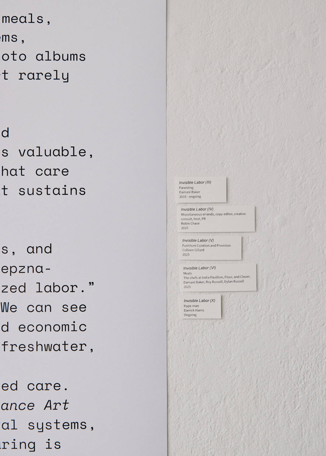 "We installed this show two weeks before a most uncaring political leader was sworn in as president, over a year into a genocide in Gaza, and as wild fires ripped through Los Angeles. Diving into the creative practice of each of these caregivers was revealing that what holds the world up might be more abundant than we think."