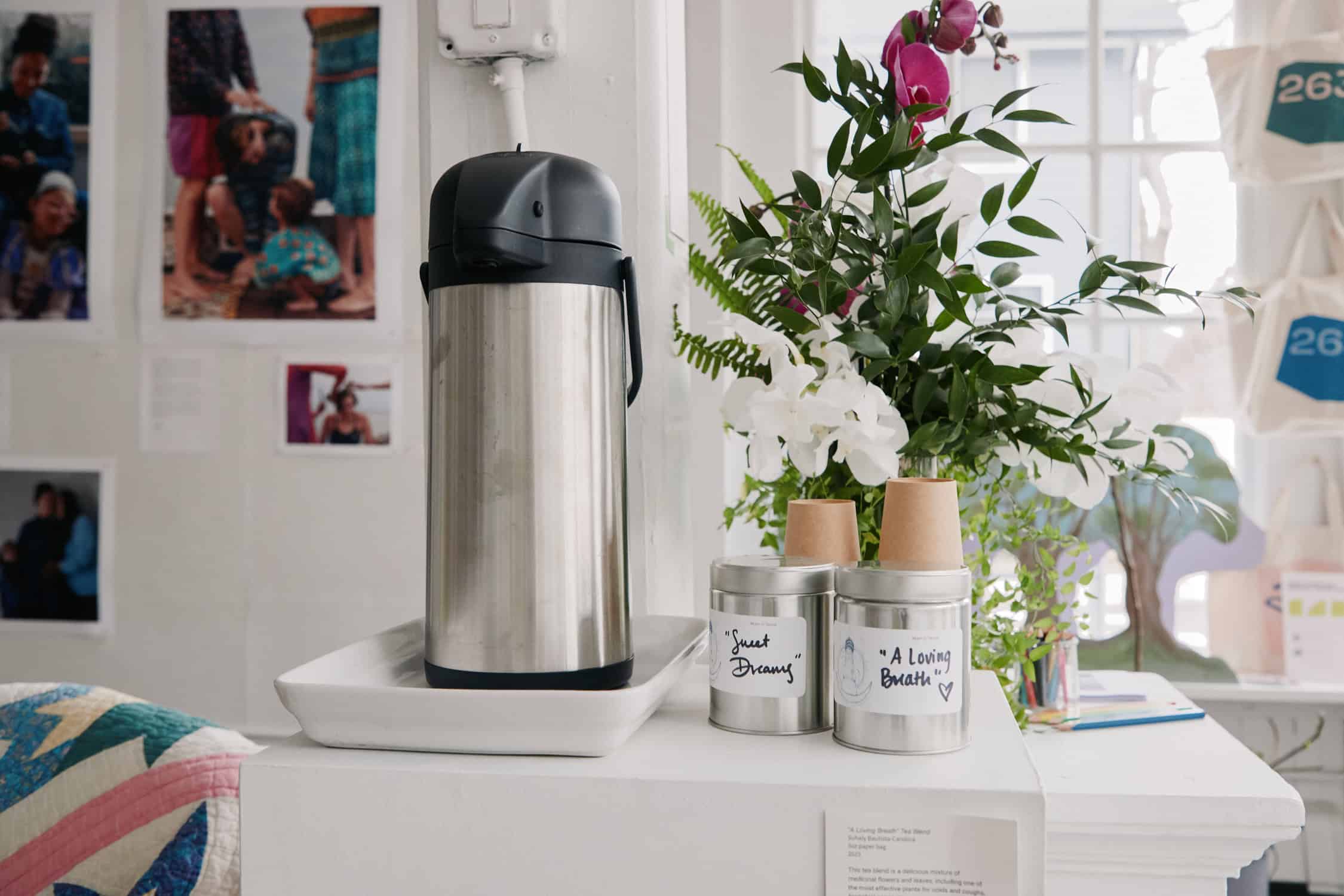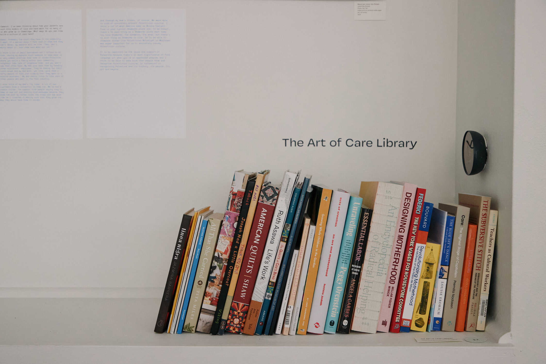 "As artist-caregivers ourselves, we really took the same approach to making art as we take to caring: understanding that it is ongoing, that it requires maintenance and revision and responsiveness to the needs of each new day. We meant for this exhibit to care for people who visited. We have eye-spy gallery tours for kids, we installed a couch, chairs, coffee tables, built a library that also had books for children, hung some of the art very low especially for kids to see. One of the artists we profiled, Suhaly Bautista-Carolina, is an herbalist and she gave us a tea that we brew so guests can have a warm treat when they come in from the snow. We hope that it feels like an introspective, calm, caring place to gestate new ideas and narratives about what makes our living possible and how to be inside this painful moment in history."