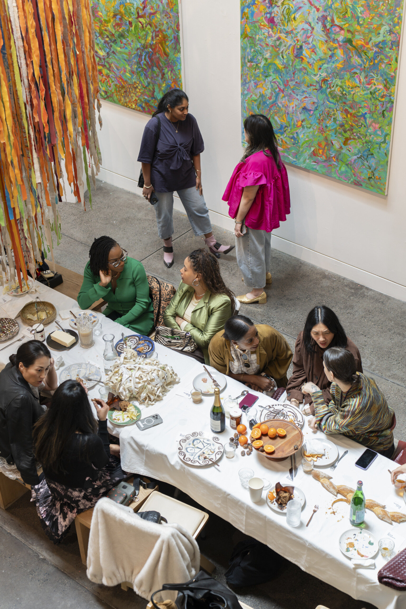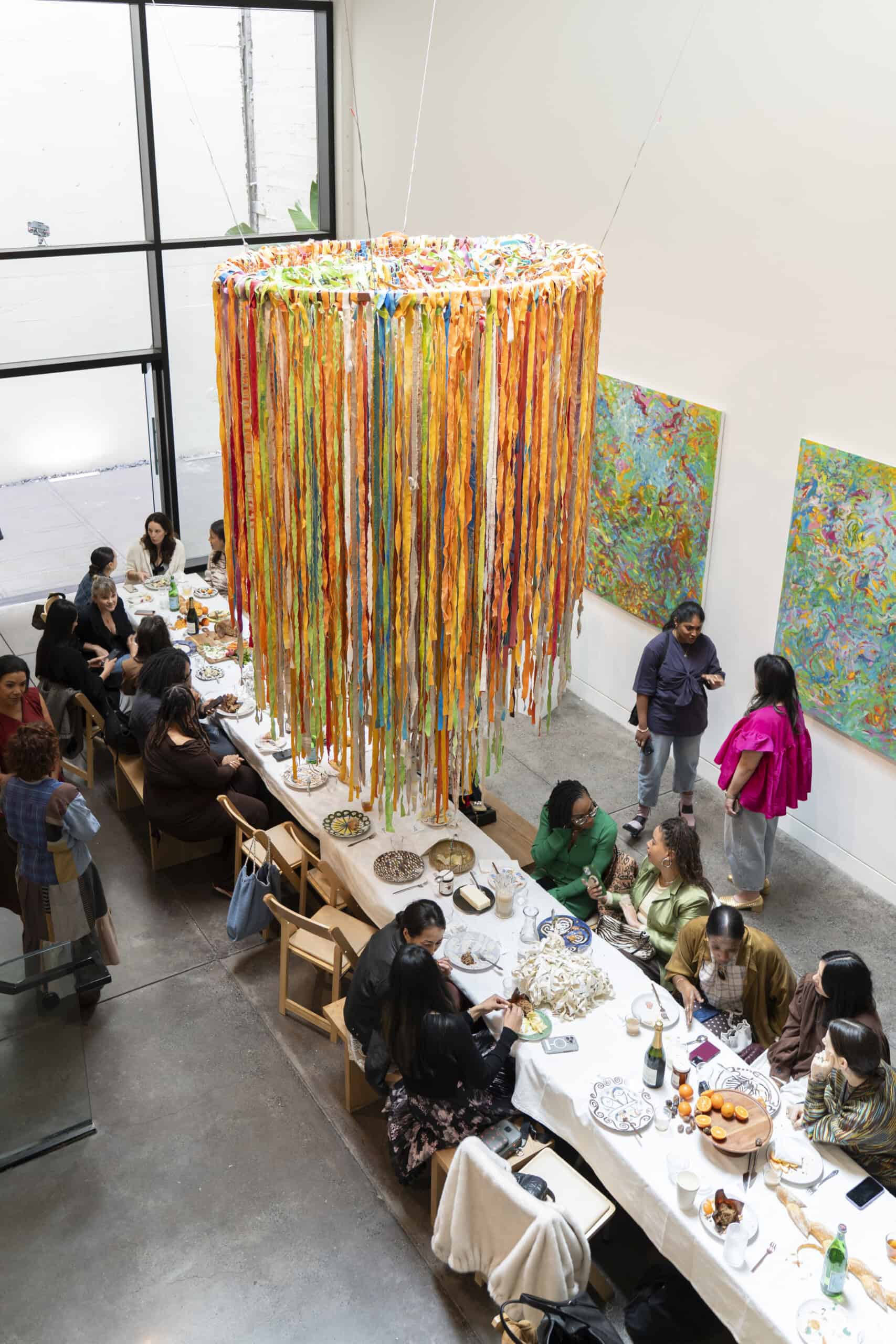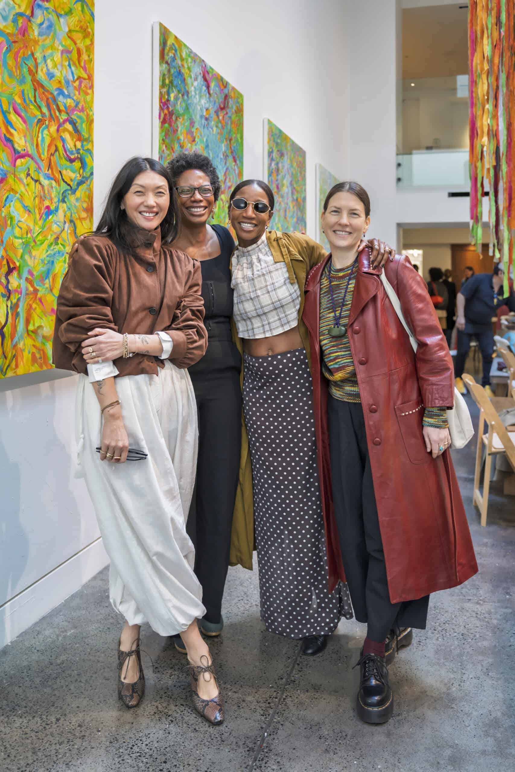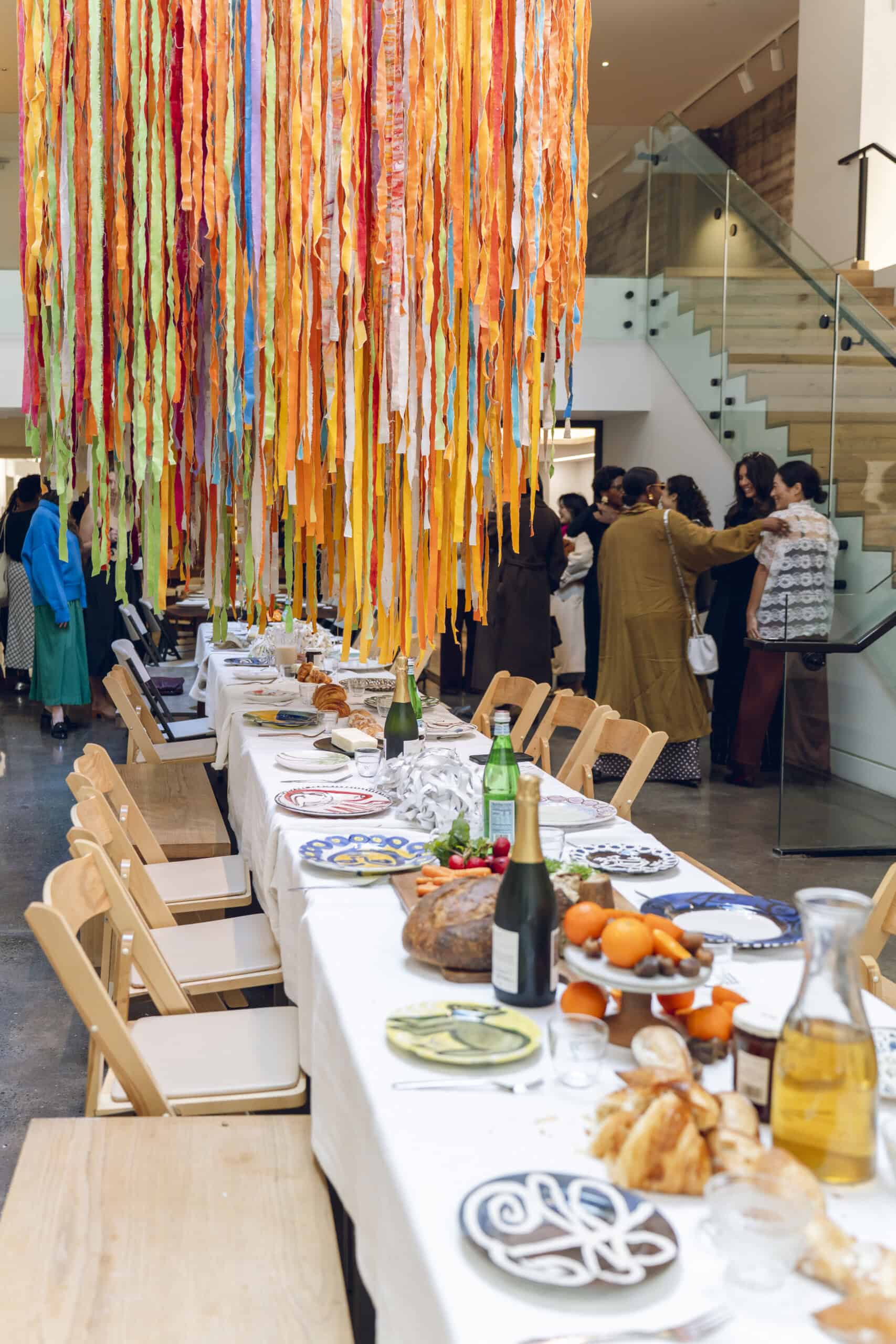 Last month, we gathered in the heart of San Francisco for an unforgettable afternoon at the mom-owned Chandran Gallery, where we hosted a special lunch and conversation with visiting artist Shara Mays. In town from her new home in Cartagena, Mays welcomed our community into the immersive world of her exhibition, TORN UP, as guests dined on a beautiful spread of teas by Leaves and Flowers, colorful jams and wine (featuring Shara’s artwork), and pastries from Tartine. Seated beneath her suspended textile sculpture and surrounded by richly layered paintings depicting roots, the experience felt intimate and deeply meaningful—art, memory, and conversation woven together in one shared space.