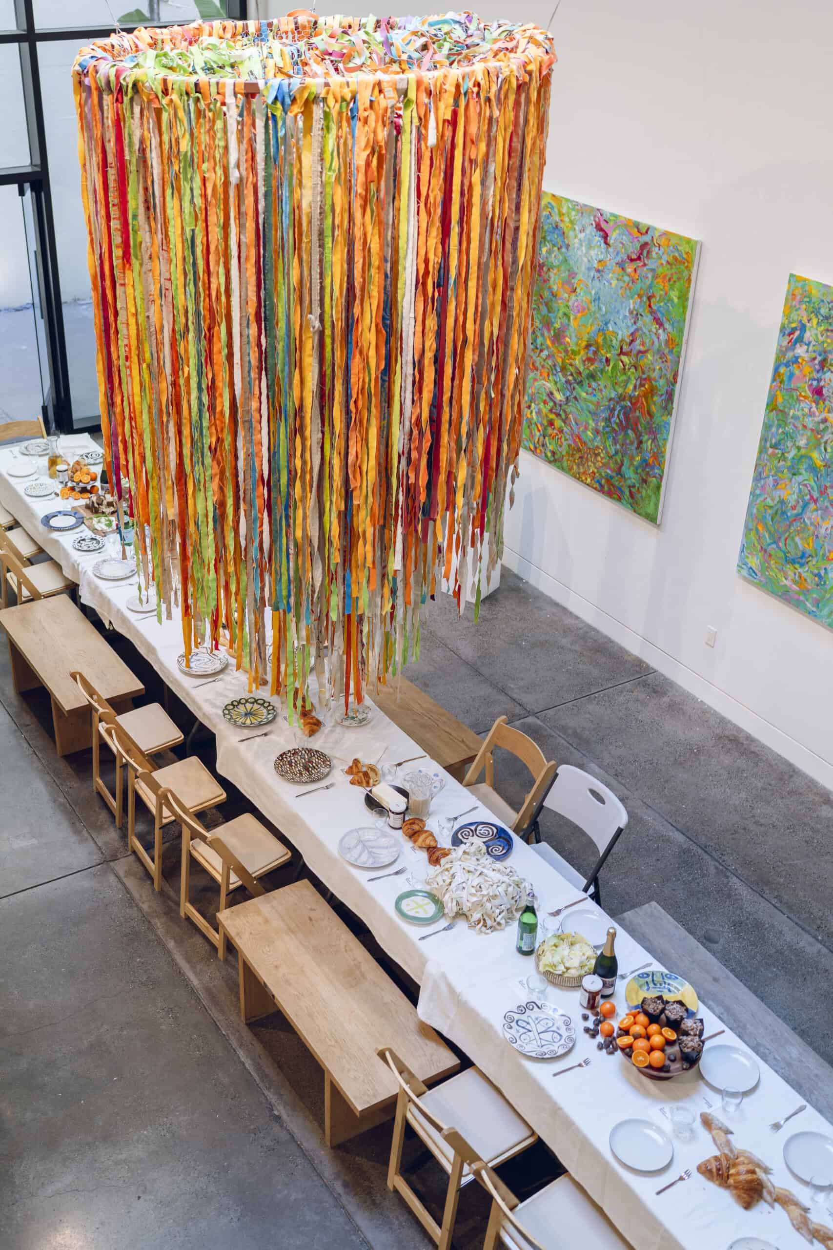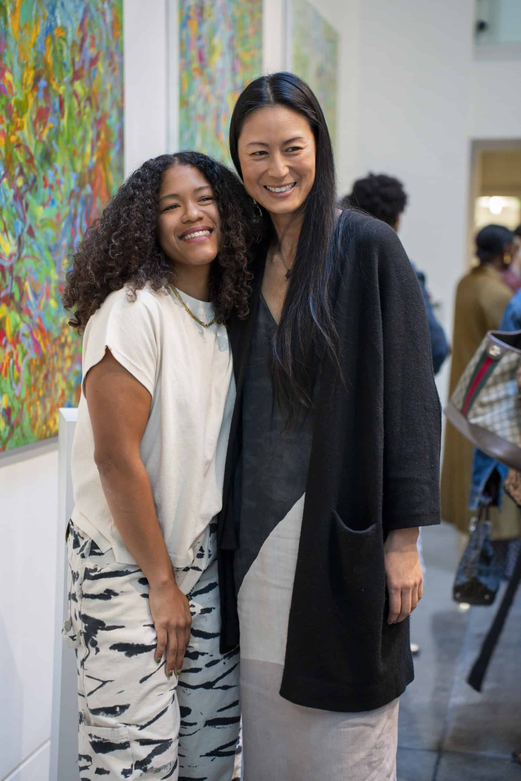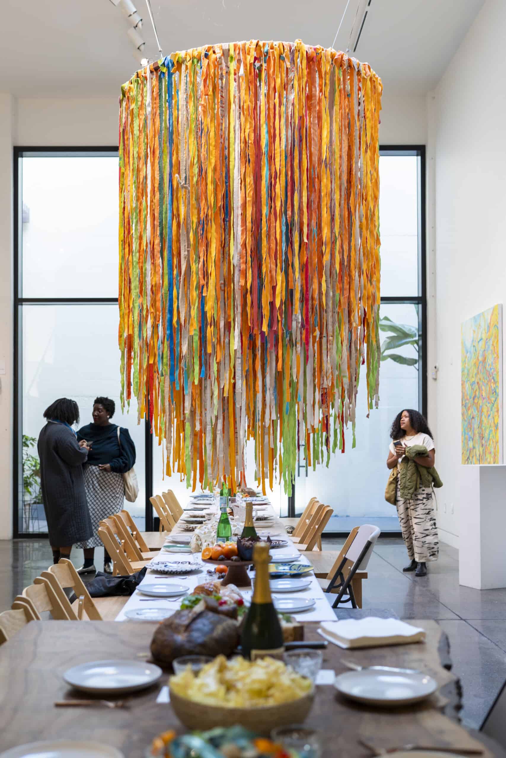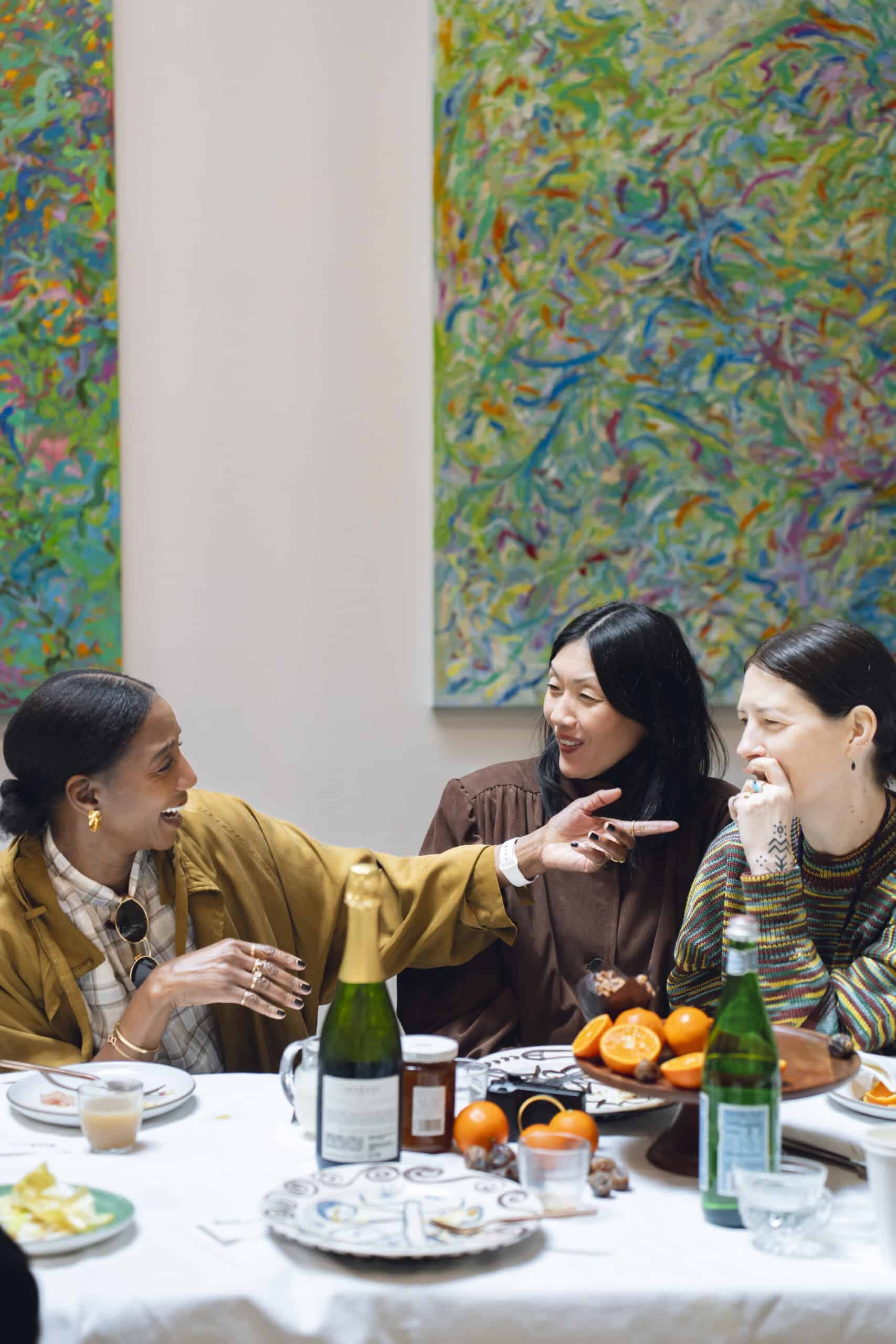 Last month, we gathered in the heart of San Francisco for an unforgettable afternoon at the mom-owned Chandran Gallery, where we hosted a special lunch and conversation with visiting artist Shara Mays. In town from her new home in Cartagena, Mays welcomed our community into the immersive world of her exhibition, TORN UP, as guests dined on a beautiful spread of teas by Leaves and Flowers, colorful jams and wine (featuring Shara’s artwork), and pastries from Tartine. Seated beneath her suspended textile sculpture and surrounded by richly layered paintings depicting roots, the experience felt intimate and deeply meaningful—art, memory, and conversation woven together in one shared space.