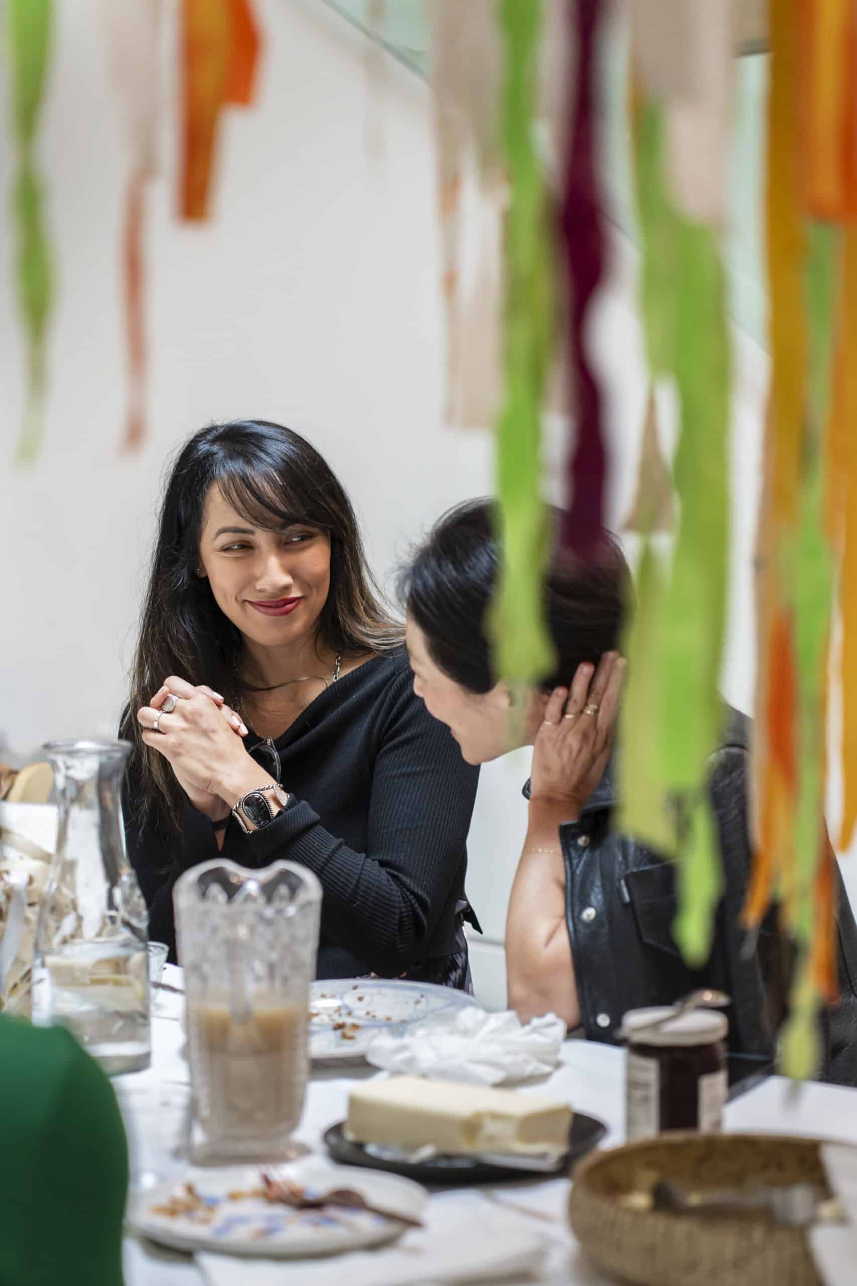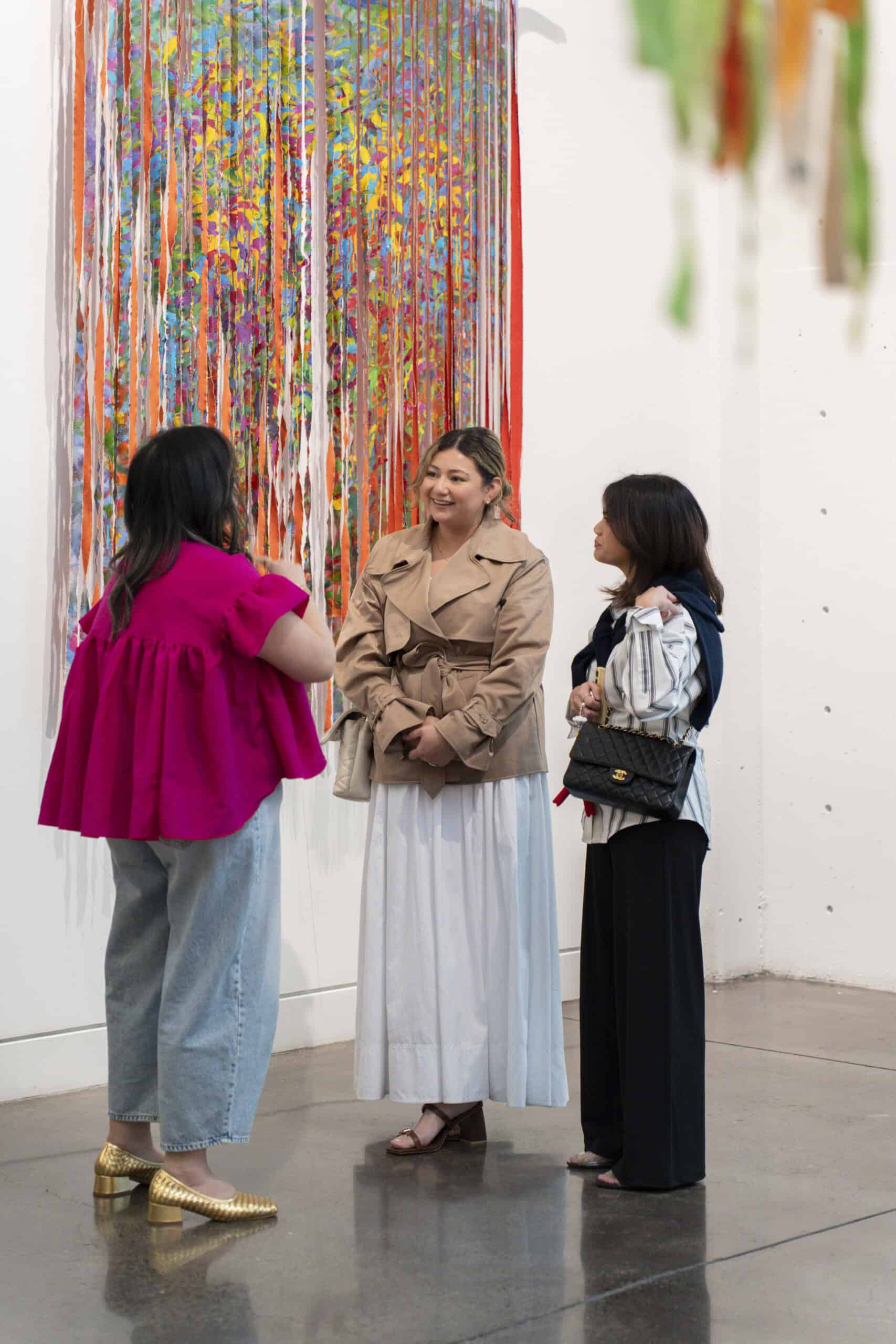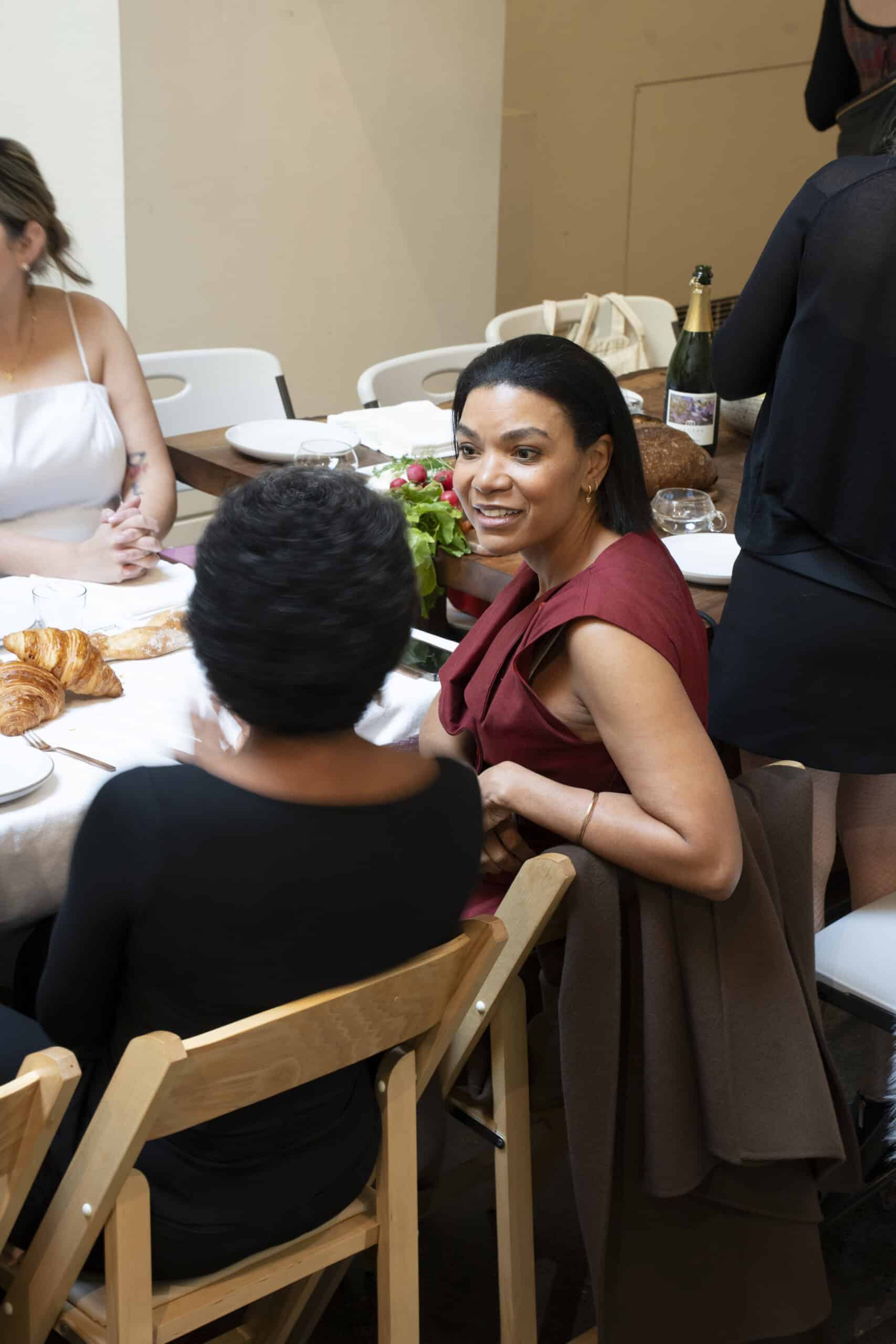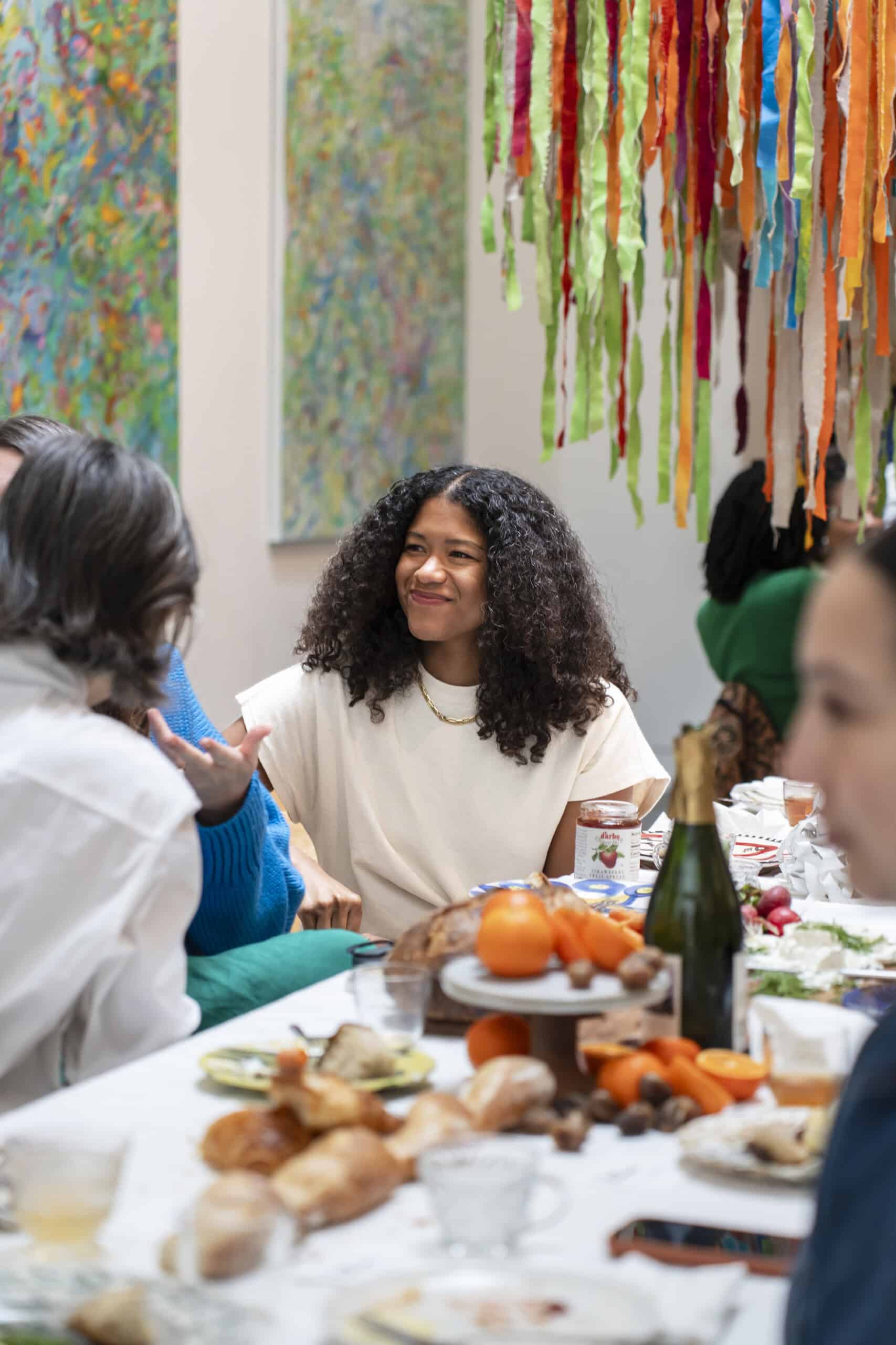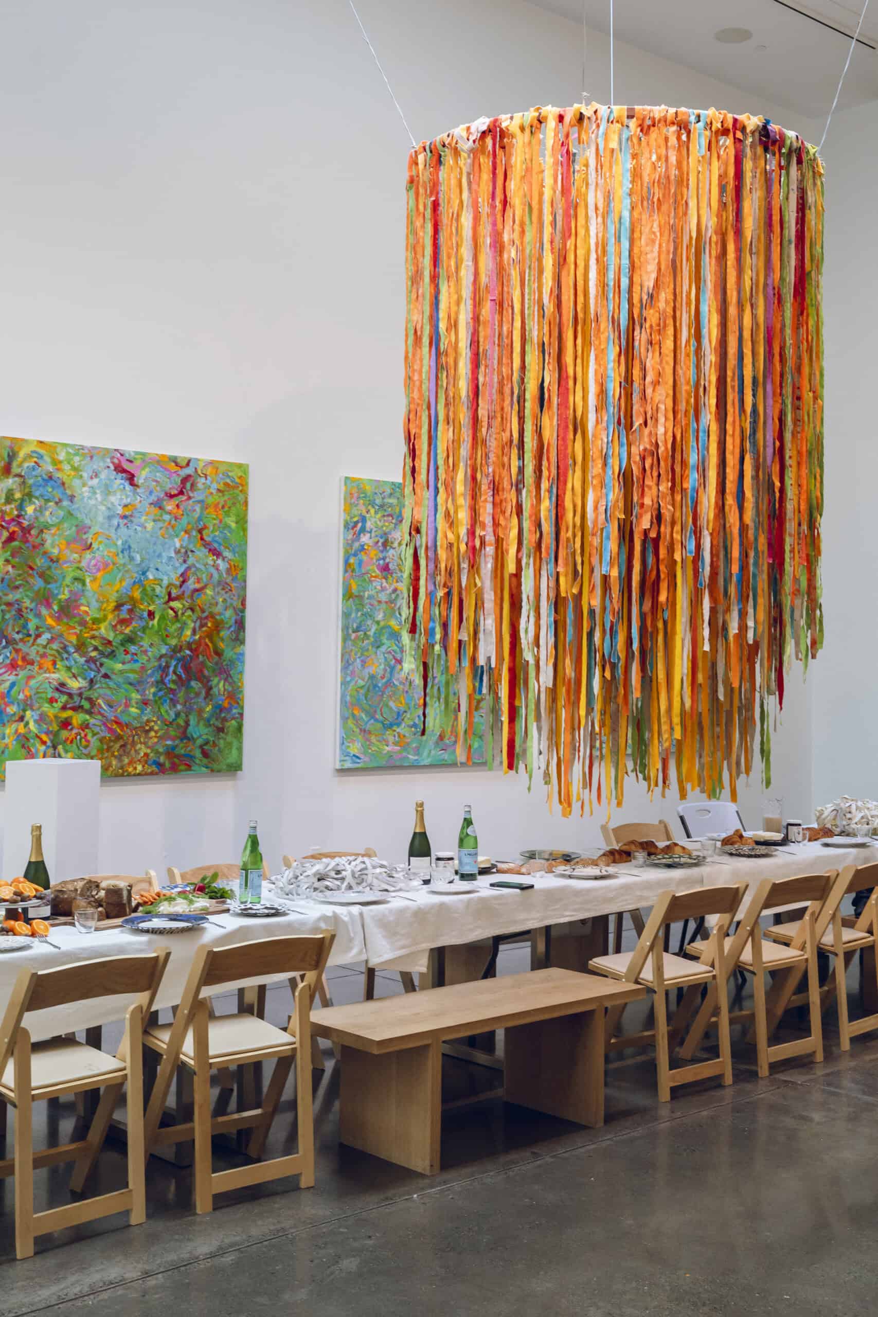 Last month, we gathered in the heart of San Francisco for an unforgettable afternoon at the mom-owned Chandran Gallery, where we hosted a special lunch and conversation with visiting artist Shara Mays. In town from her new home in Cartagena, Mays welcomed our community into the immersive world of her exhibition, TORN UP, as guests dined on a beautiful spread of teas by Leaves and Flowers, colorful jams and wine (featuring Shara’s artwork), and pastries from Tartine. Seated beneath her suspended textile sculpture and surrounded by richly layered paintings depicting roots, the experience felt intimate and deeply meaningful—art, memory, and conversation woven together in one shared space.
