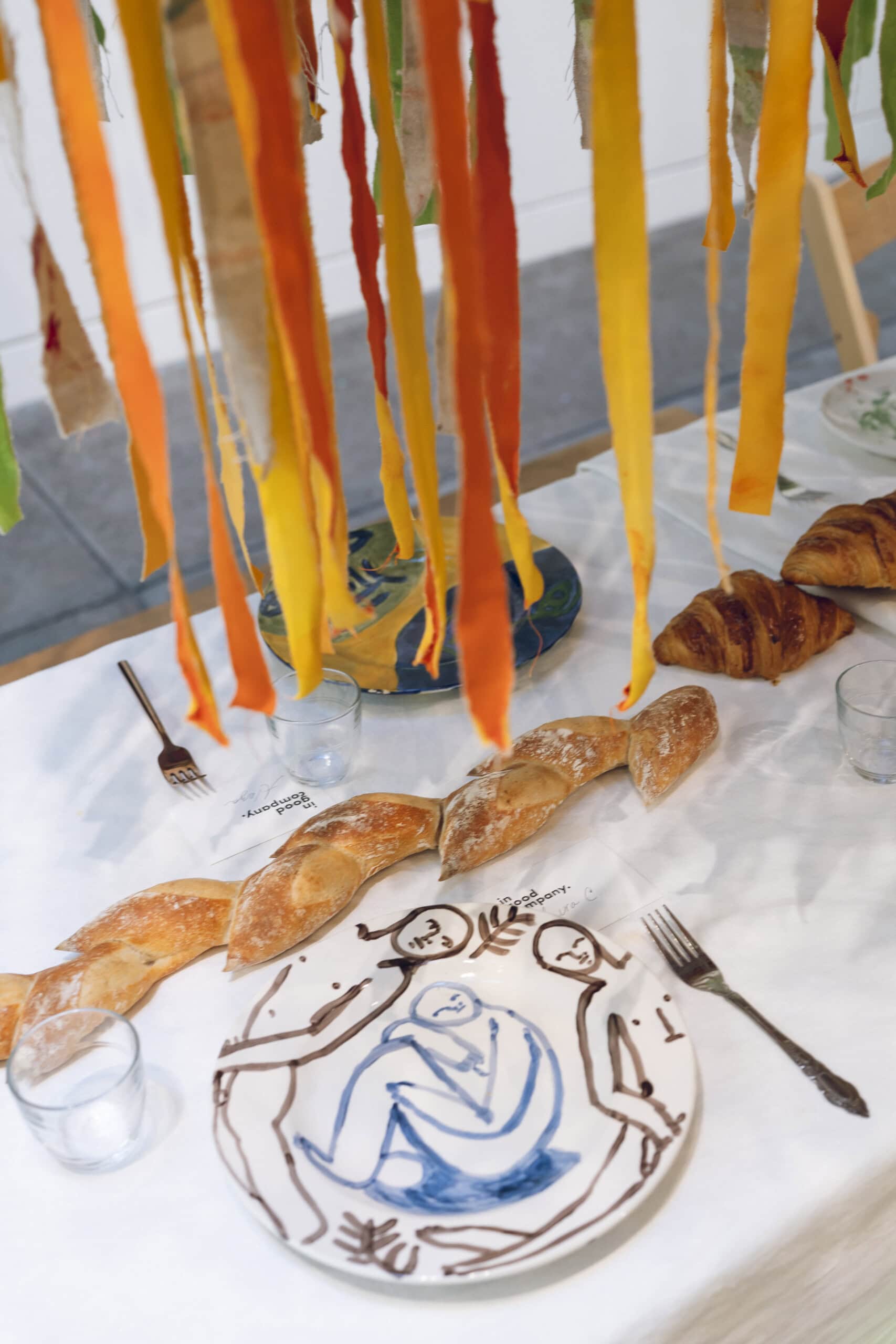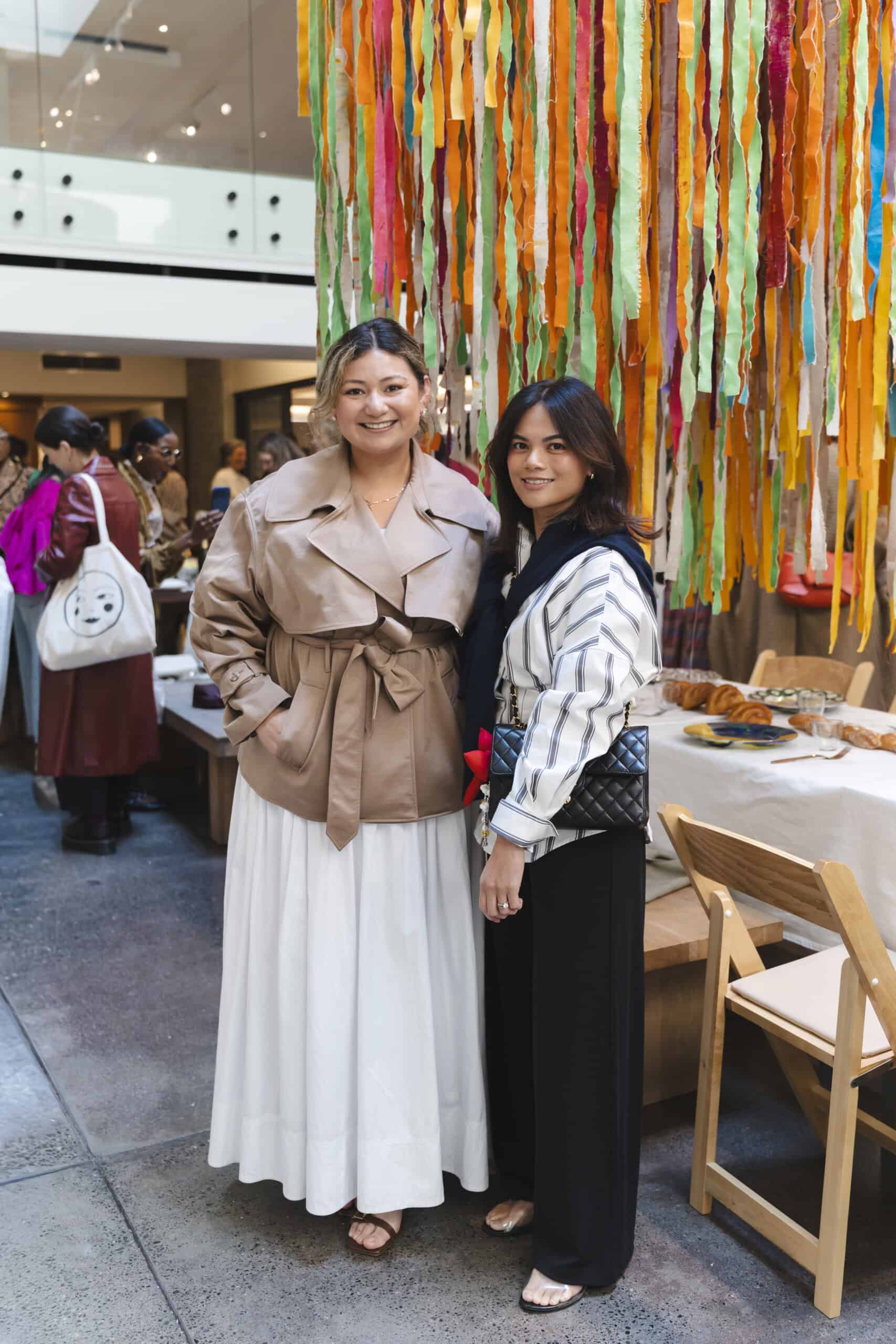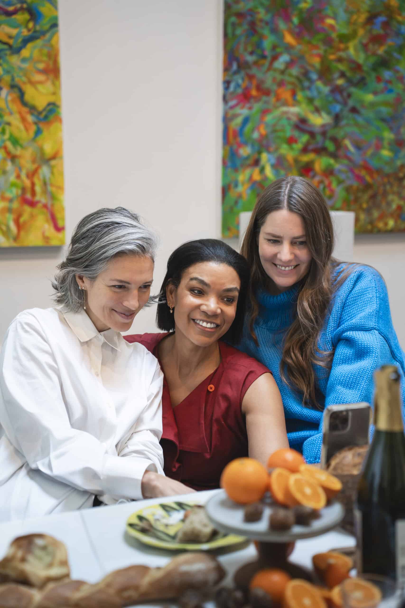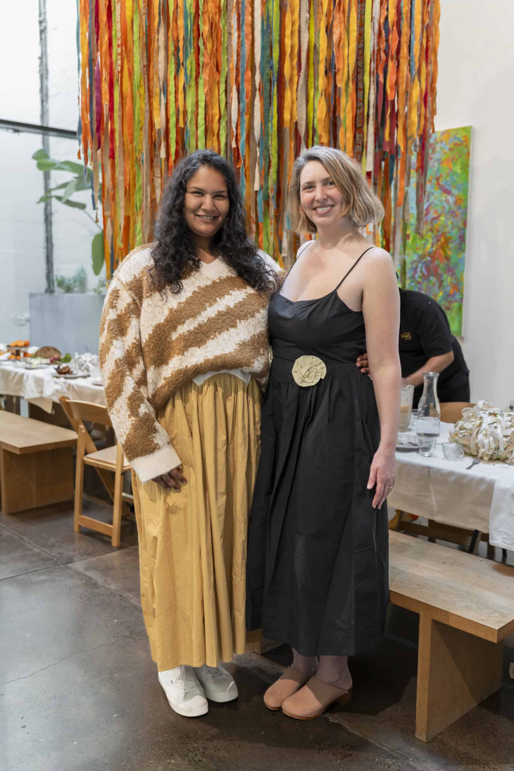 Last month, we gathered in the heart of San Francisco for an unforgettable afternoon at the mom-owned Chandran Gallery, where we hosted a special lunch and conversation with visiting artist Shara Mays. In town from her new home in Cartagena, Mays welcomed our community into the immersive world of her exhibition, TORN UP, as guests dined on a beautiful spread of teas by Leaves and Flowers, colorful jams and wine (featuring Shara’s artwork), and pastries from Tartine. Seated beneath her suspended textile sculpture and surrounded by richly layered paintings depicting roots, the experience felt intimate and deeply meaningful—art, memory, and conversation woven together in one shared space.