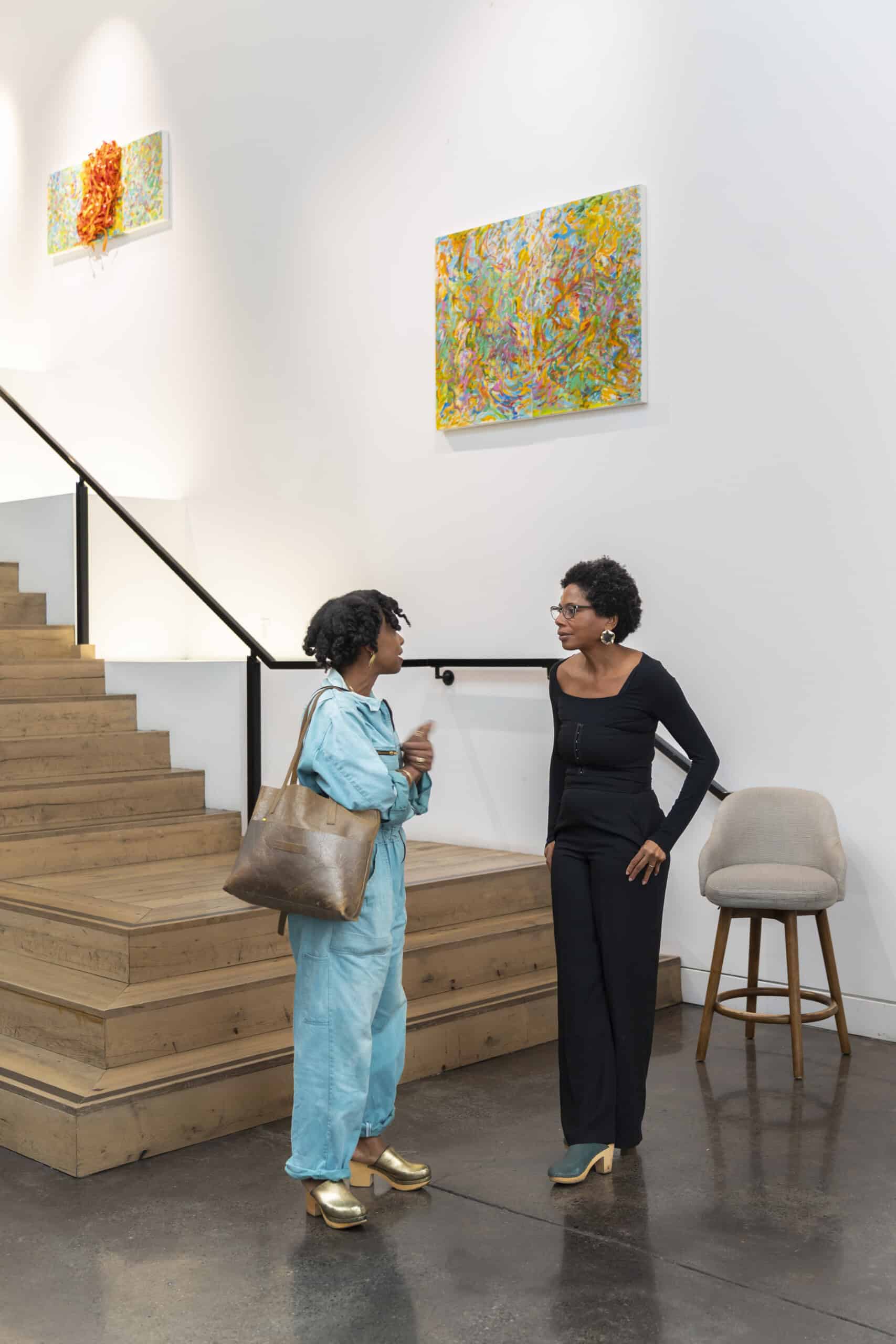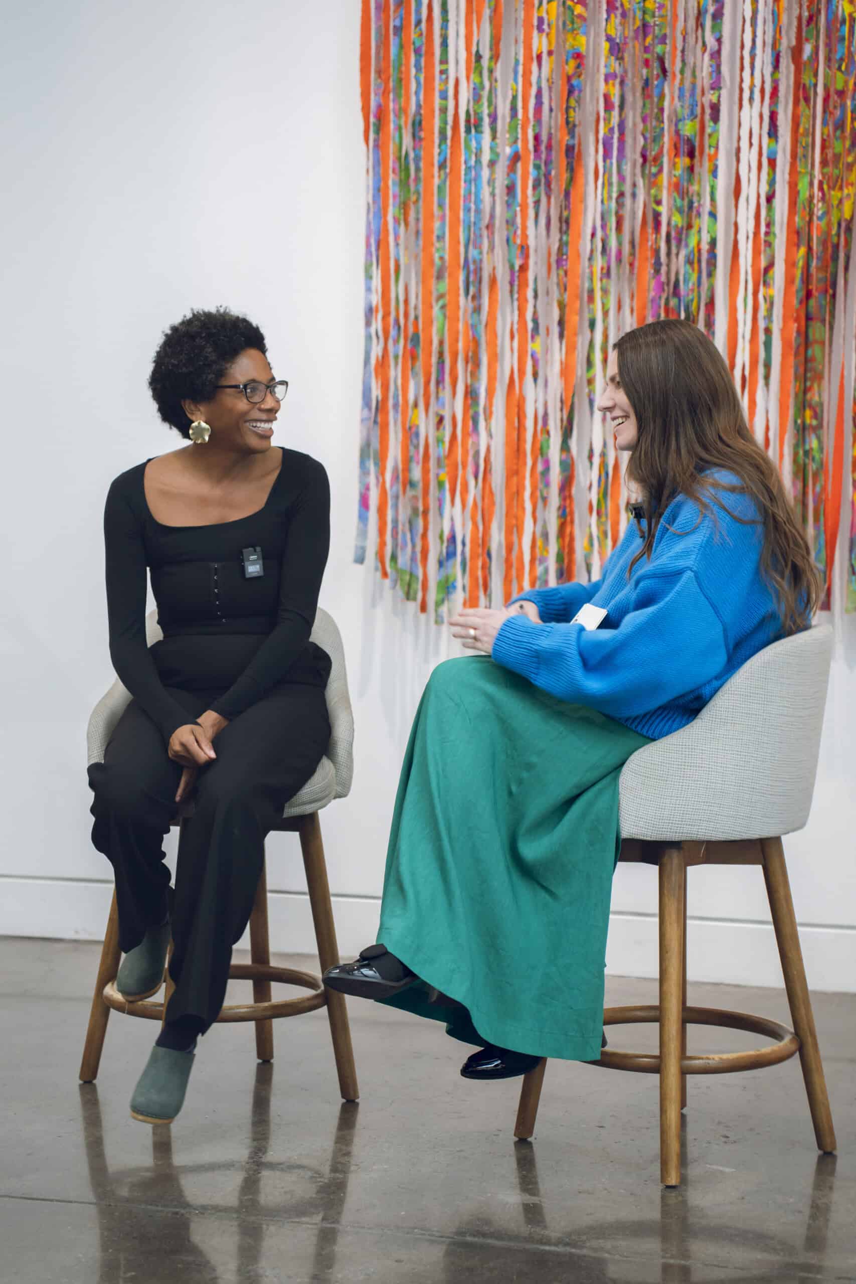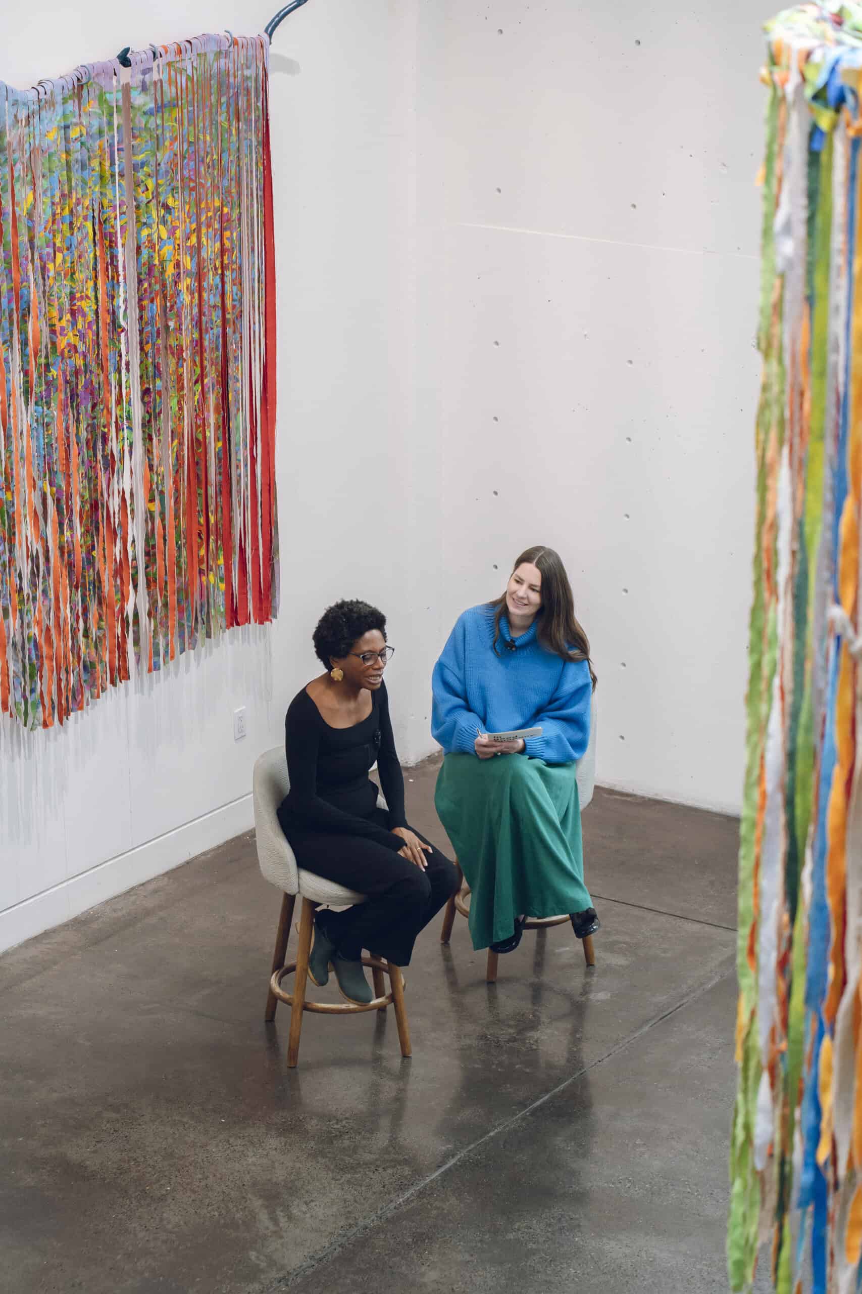 Over lunch, we sat down with Mays for a live conversation that moved fluidly between life and work: raising two now-adult daughters, inspiration found in her new studio in Colombia, and the emotional depth embedded in her practice. She spoke about the personal roots of TORN UP, from honoring her grandfather’s labor as a house painter in the American South to the powerful act of naming—titling her works after names found on slave manifests as gestures of remembrance and reclamation.