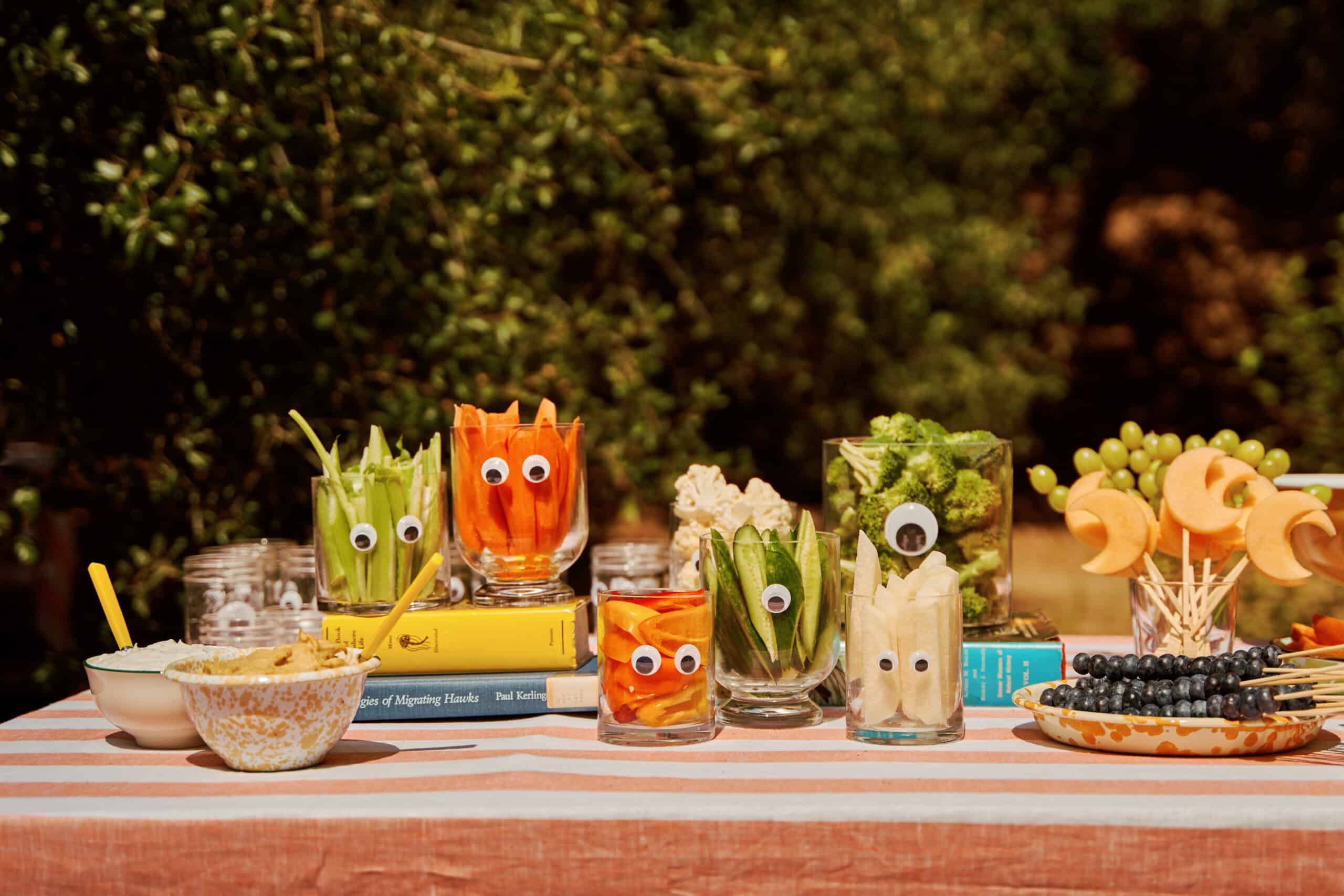 "I wanted all of the food to be so appealing that the kids would actually eat it—bite-size, snacky, and playful. Displaying cut veggies in googly-eye-adorned glass vessels turned the ubiquitous crudité spread into an edible monster garden. Fruit cut into fun shapes and artfully stacked on skewers had both visual appeal and was easy for littles to grab and munch on while passing by the buffet table. Chef Michelle Laine helped us bring it all to life, and the colorfully dotted chocolate cake was made by Poems N Pastry."