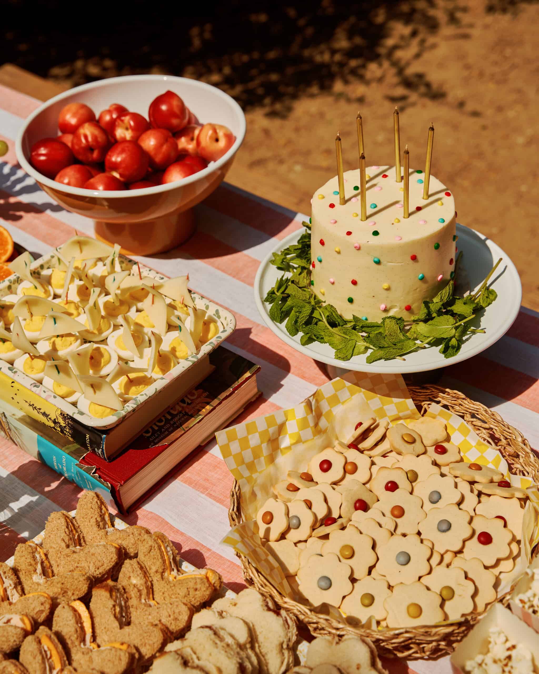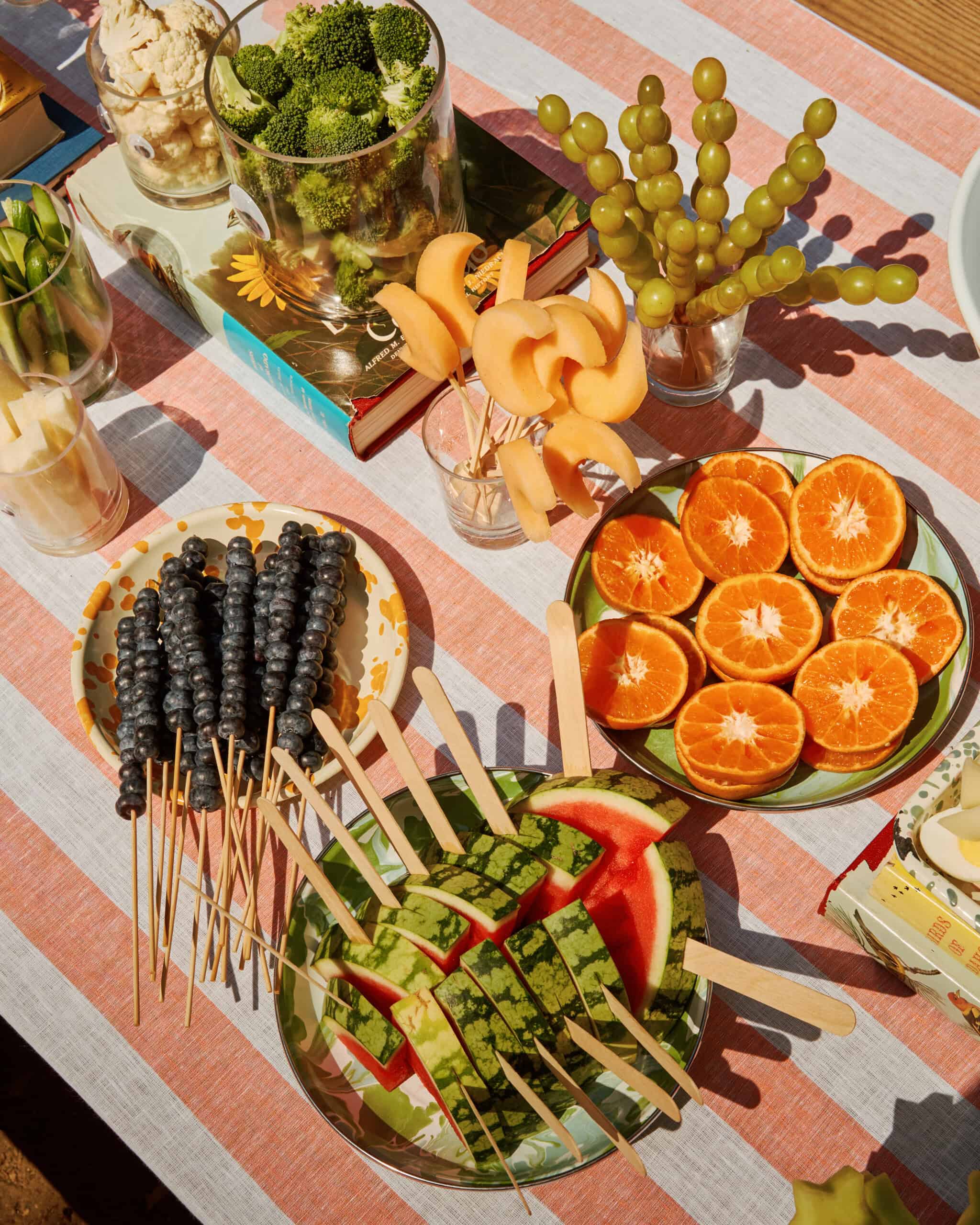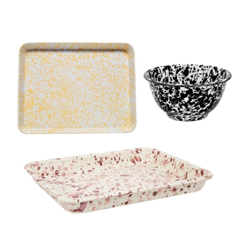 "I love mixing pattern and color—it's about playing with scale and finding harmony in the right balance of elements. Designing a table with no single-use products was important to me, but because the party was outside with a bunch of 6-year-olds, I couldn't use anything precious or breakable. When I was in Todos Santos early this summer, I discovered the Mexican enamelware brand PP.Peltre. Their cool designs were a jumping off point. And then, I mixed in even more enamelware (serving pieces, tumblers) from Crow Canyon and Falcon. It's such a durable, kid-friendly material—that's not plastic."