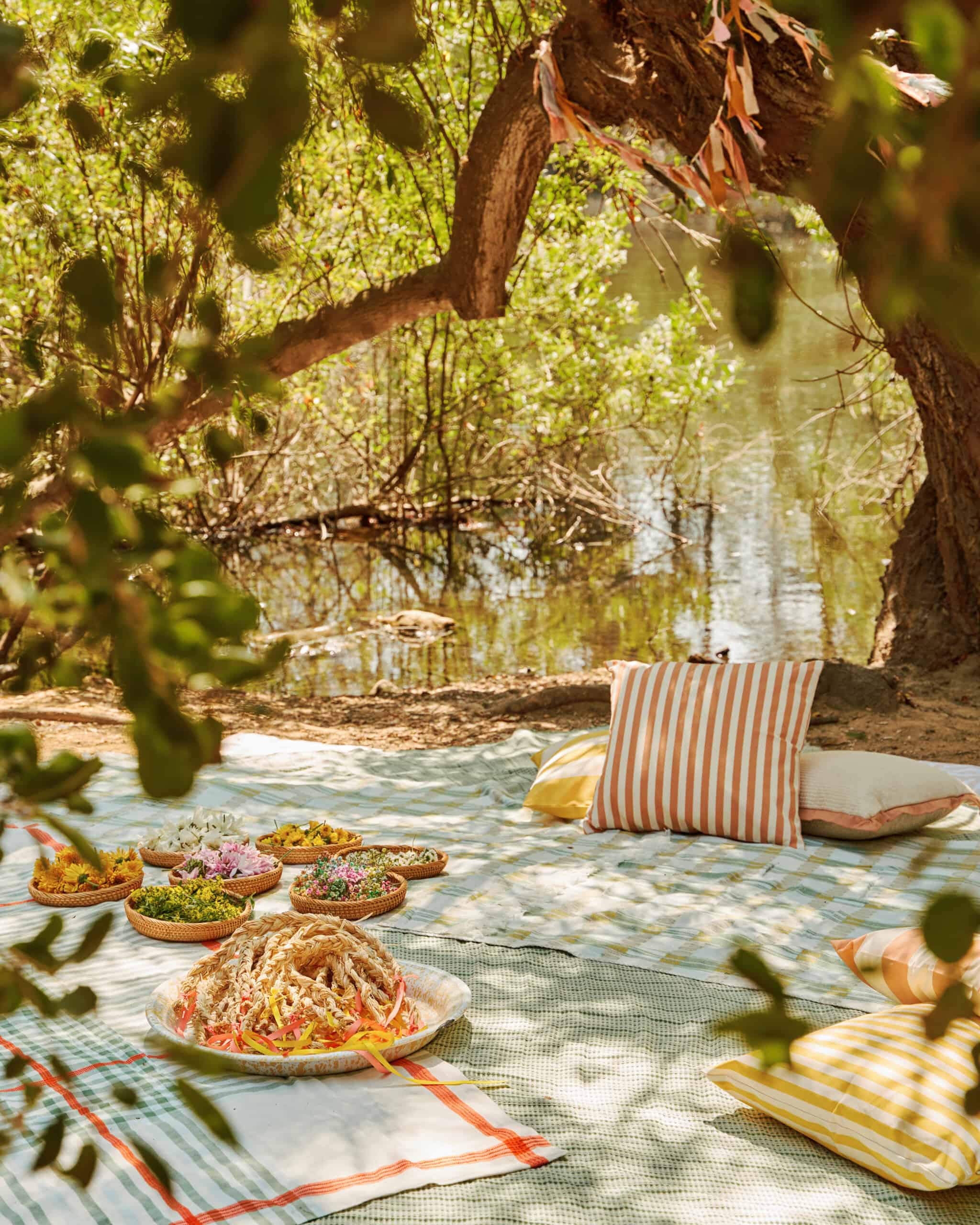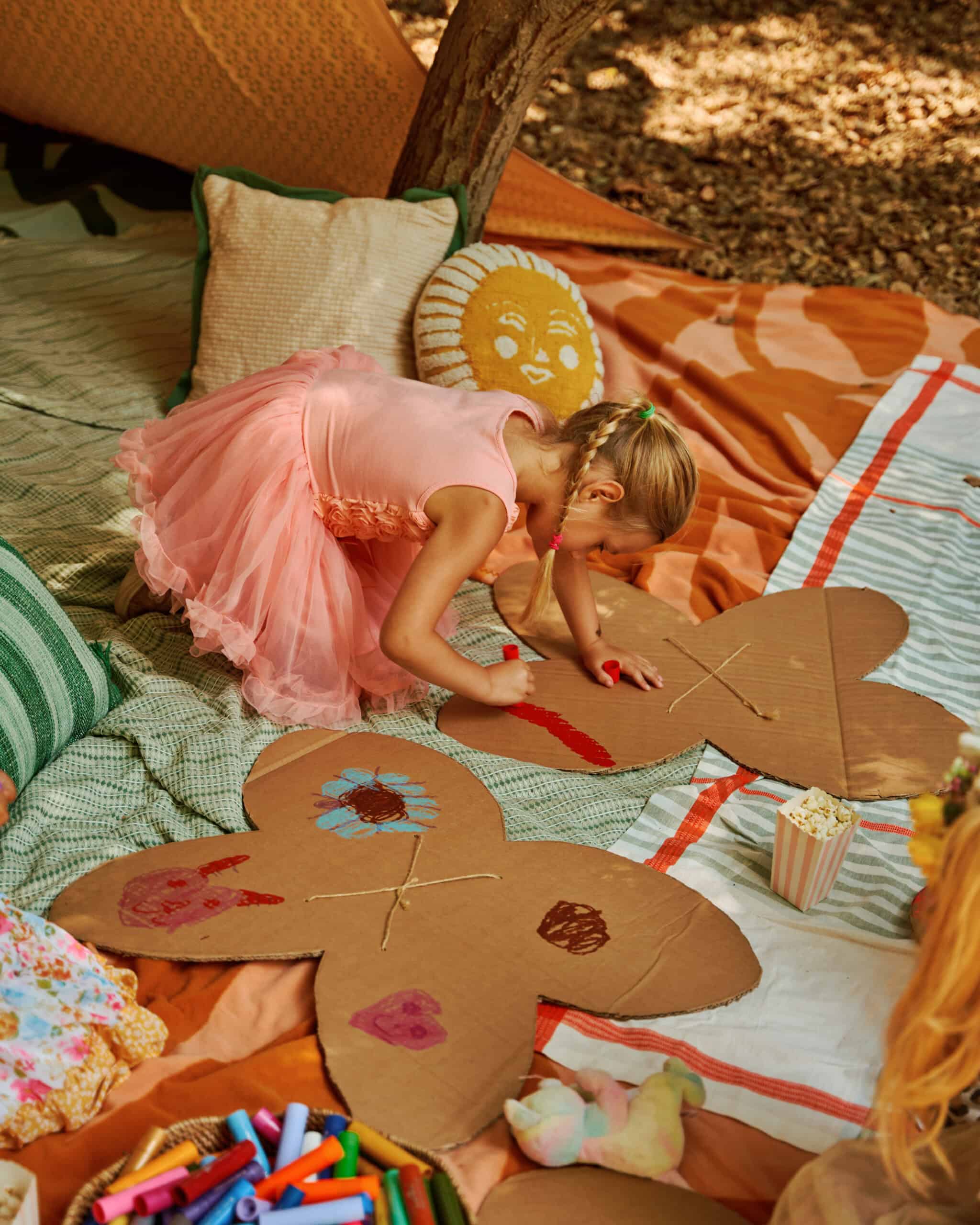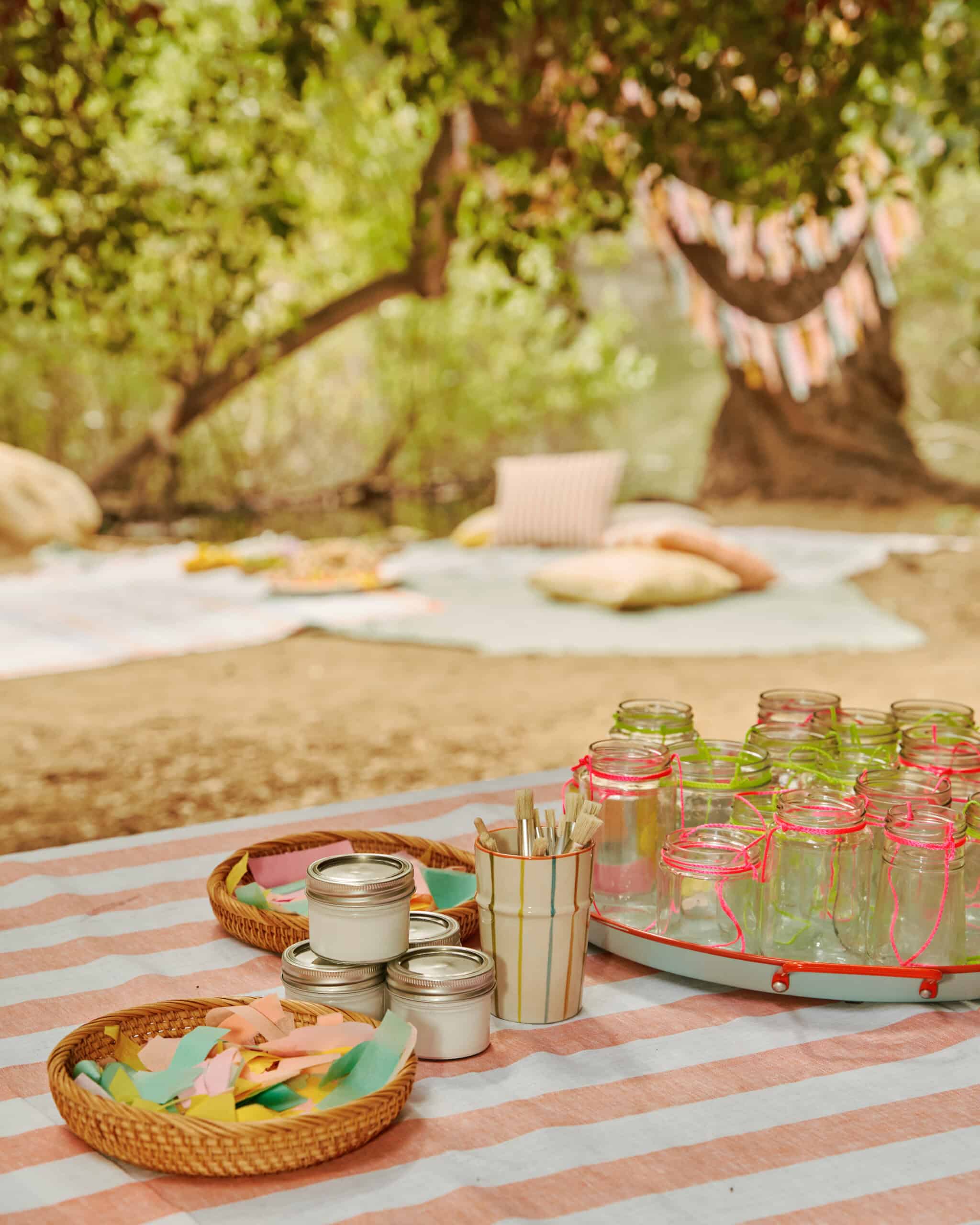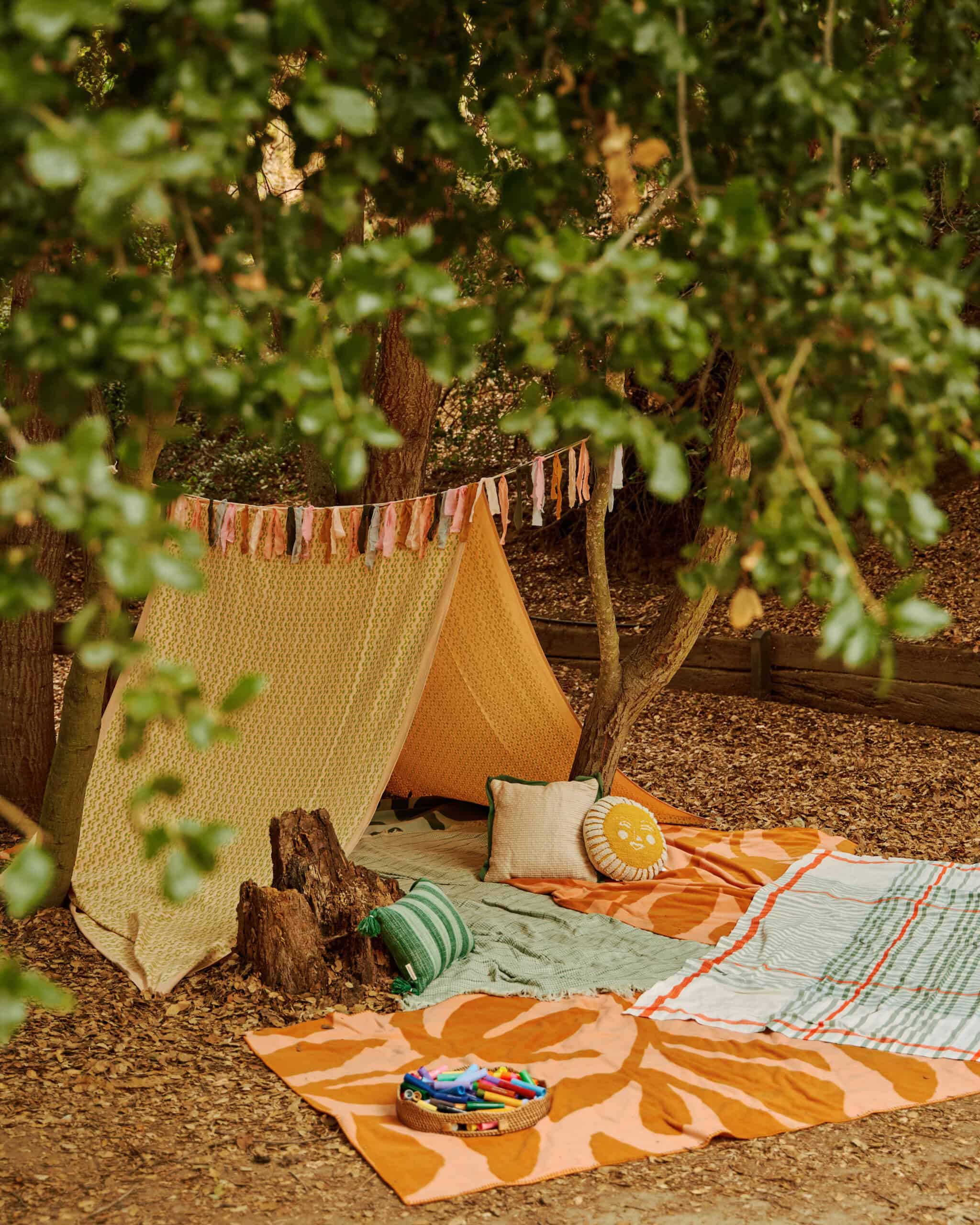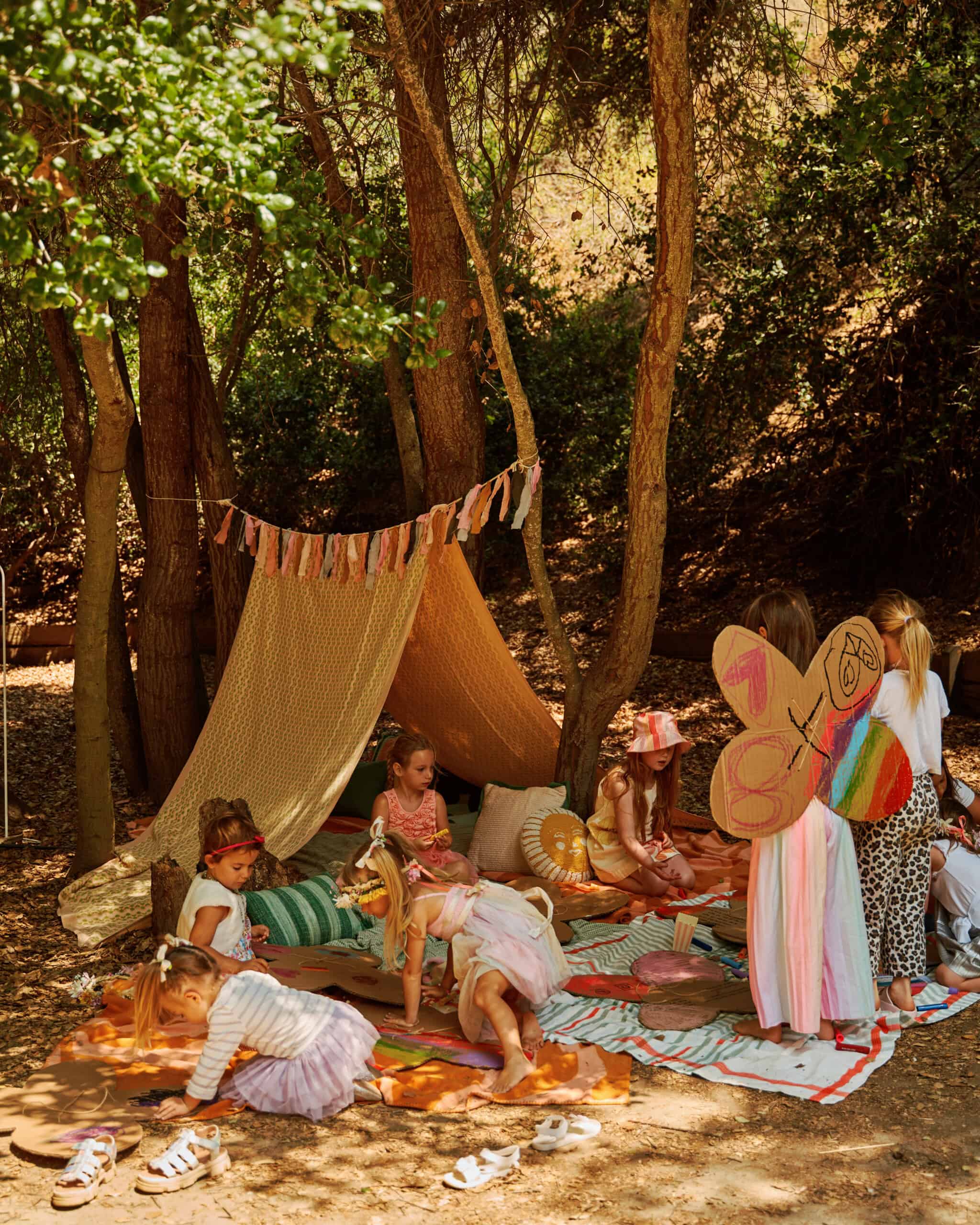 "Fortunately, the Heavenly Pond area at Franklin Canyon Park has several large, sturdy tables that we could use for the food, dining, and some crafting. But there were so many charming spaces under the tree canopy that we wanted to take advantage of. We used a couple of Block Shop tablecloths—plus several picnic blankets and throw pillows—to create a tented hangout zone for chilling and butterfly-wing decorating (aka: Club Coco)."