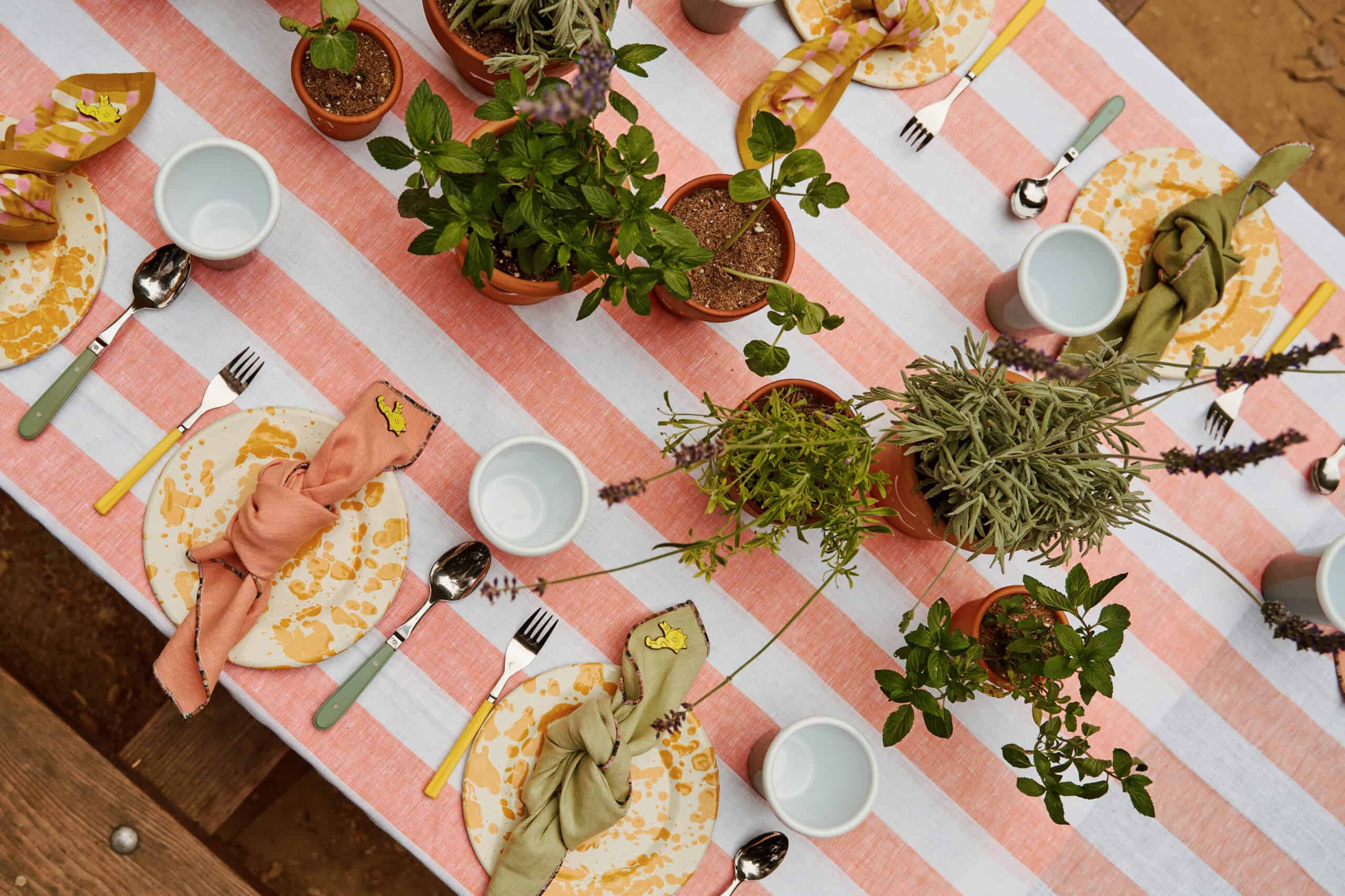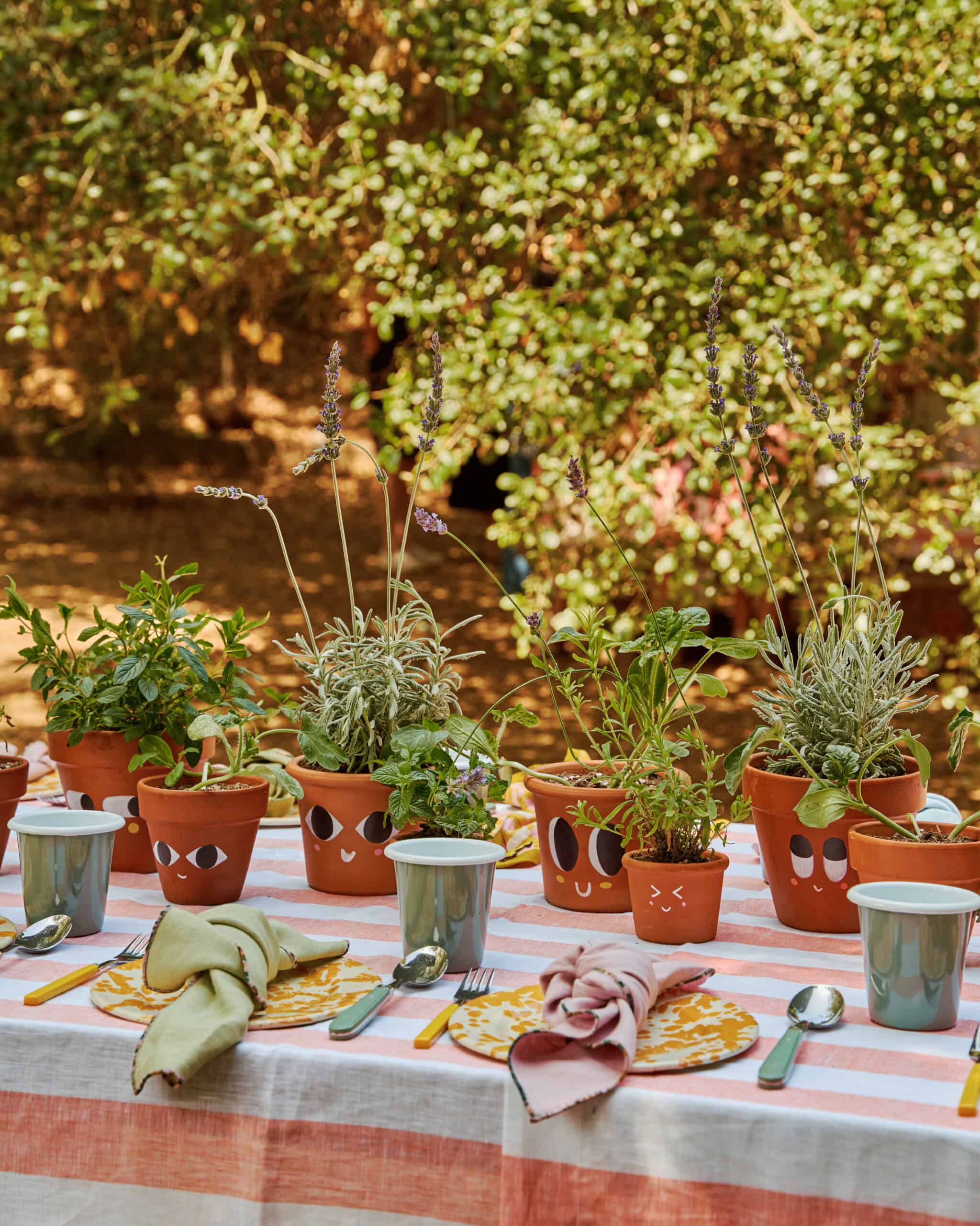 "When I found Solino Home's Cabana-Stripe tablecloth and Atelier Saucier's Mix-and-Match Chroma napkins the table design really came together. Colorful vintage flatware was sourced from eBay, and the hand-painted potted plants (created by Coco's dad AJ Mapes) were the playful finishing touch, and they doubled as party favors—each guest took one home. All of the tableware items I sourced can be used infinitely (at home or for events) and I can even loan them to friends for their kids' parties!"