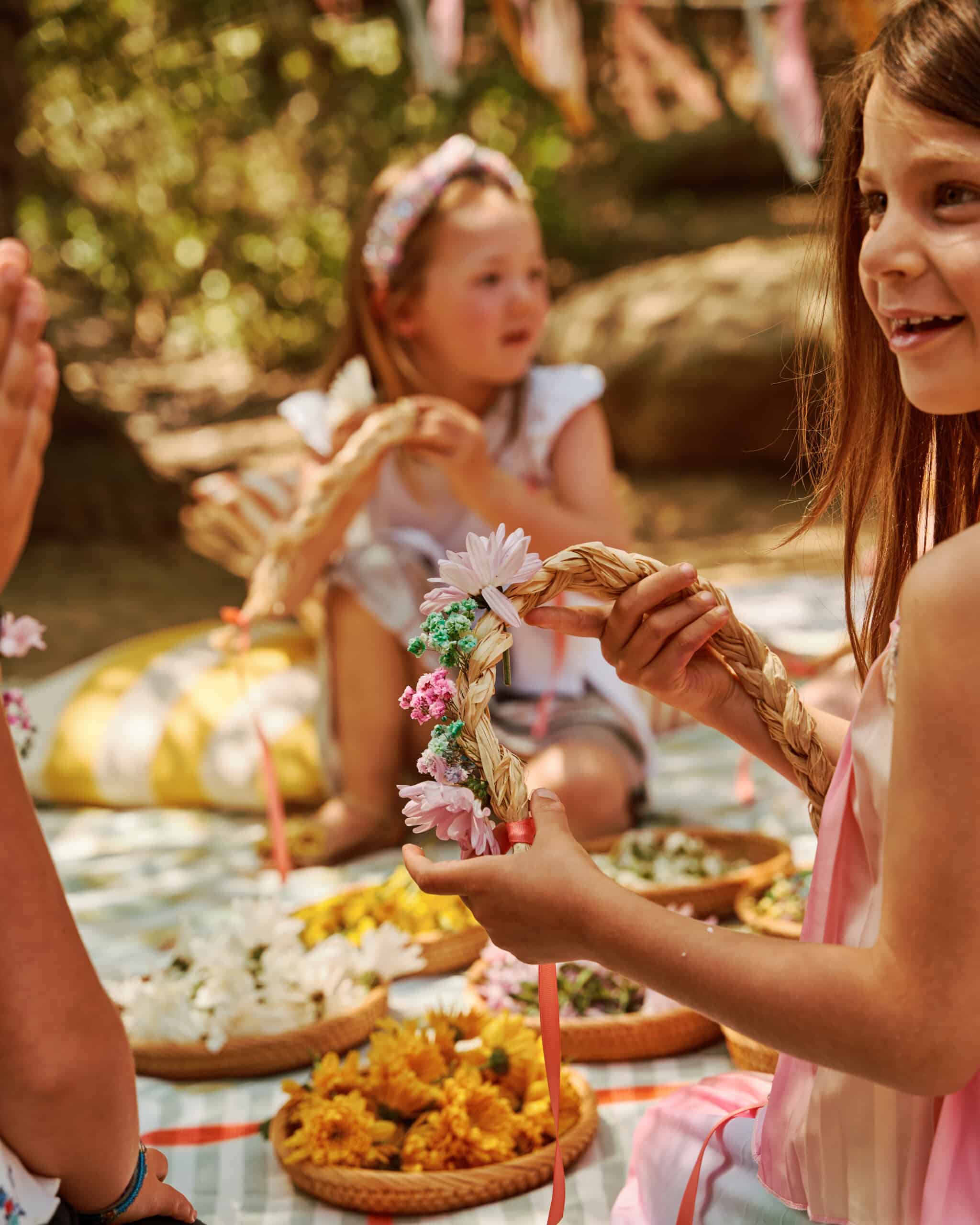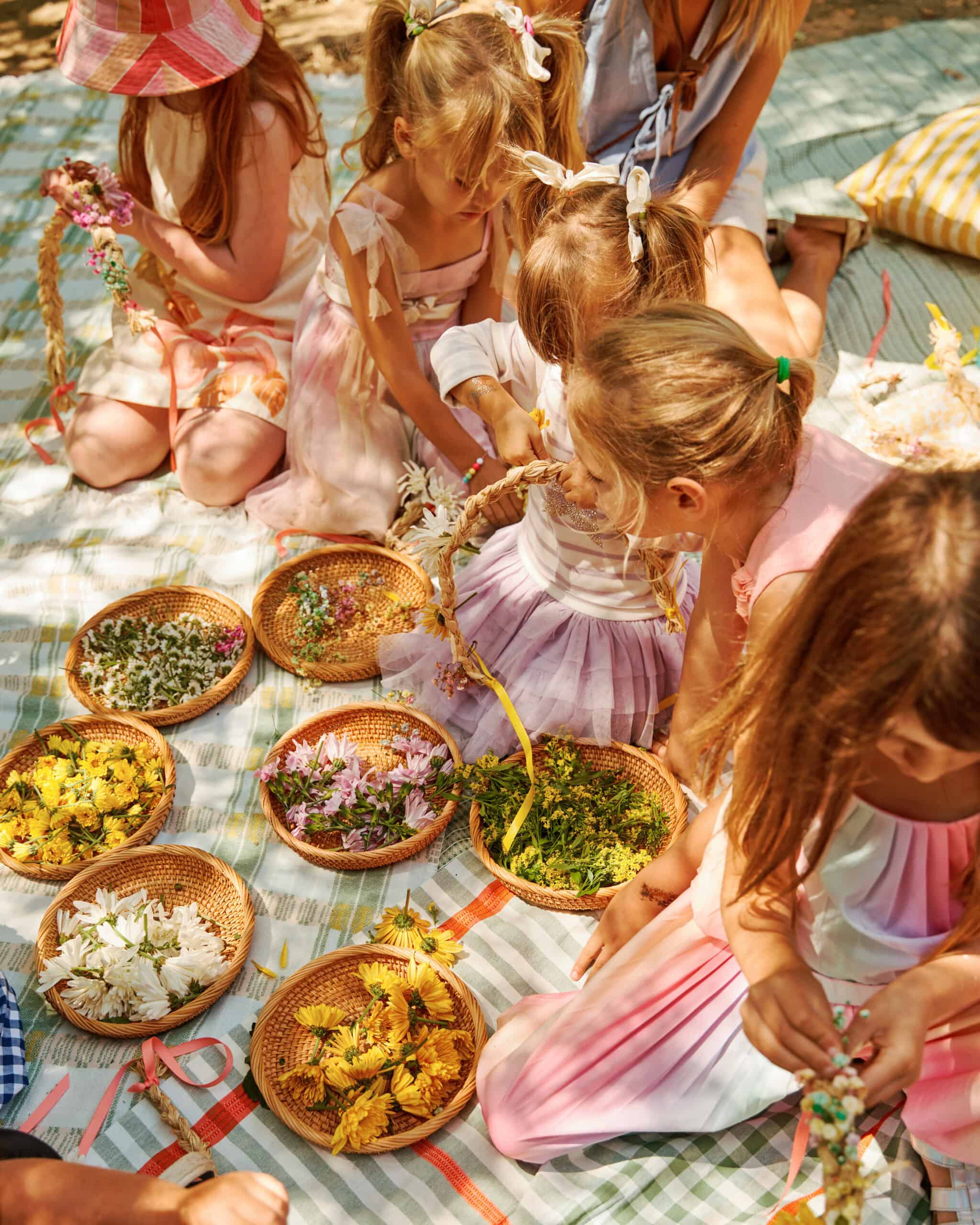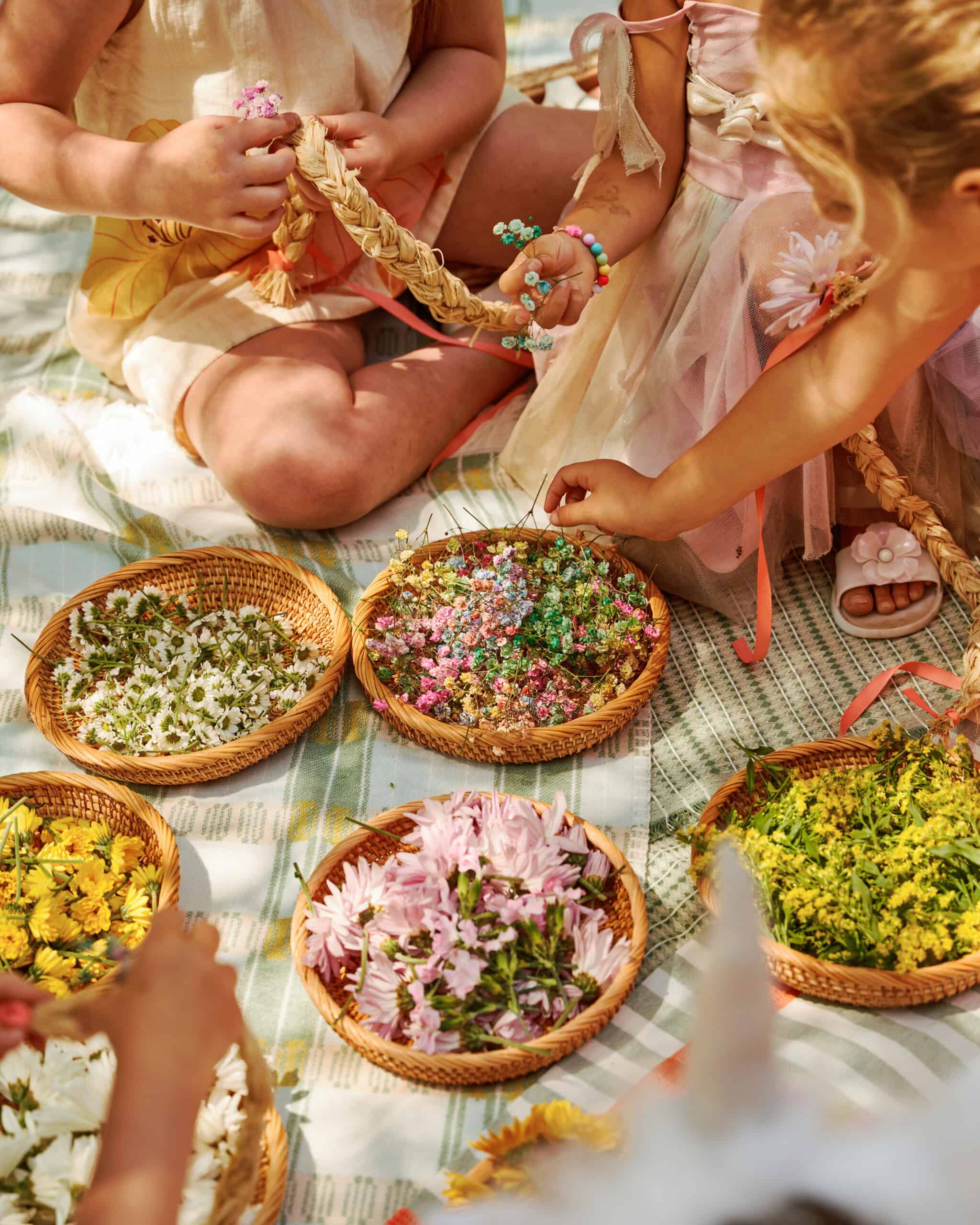 "We utilized a flower-crown-making technique that's so straightforward, even a toddler could do it. The base is made out of braided raffia—that's secured at the ends with a little floral wire and ribbon. We snipped small pieces (leaving about three-inches of stem) of a bunch of hearty flowers—ones that don't wilt immediately when they're out of water (a lot of flowers sold at grocery stores work well for this—varieties like baby's breath, mums, and statice)—that the kids could easily weave into the openings in the raffia braid."