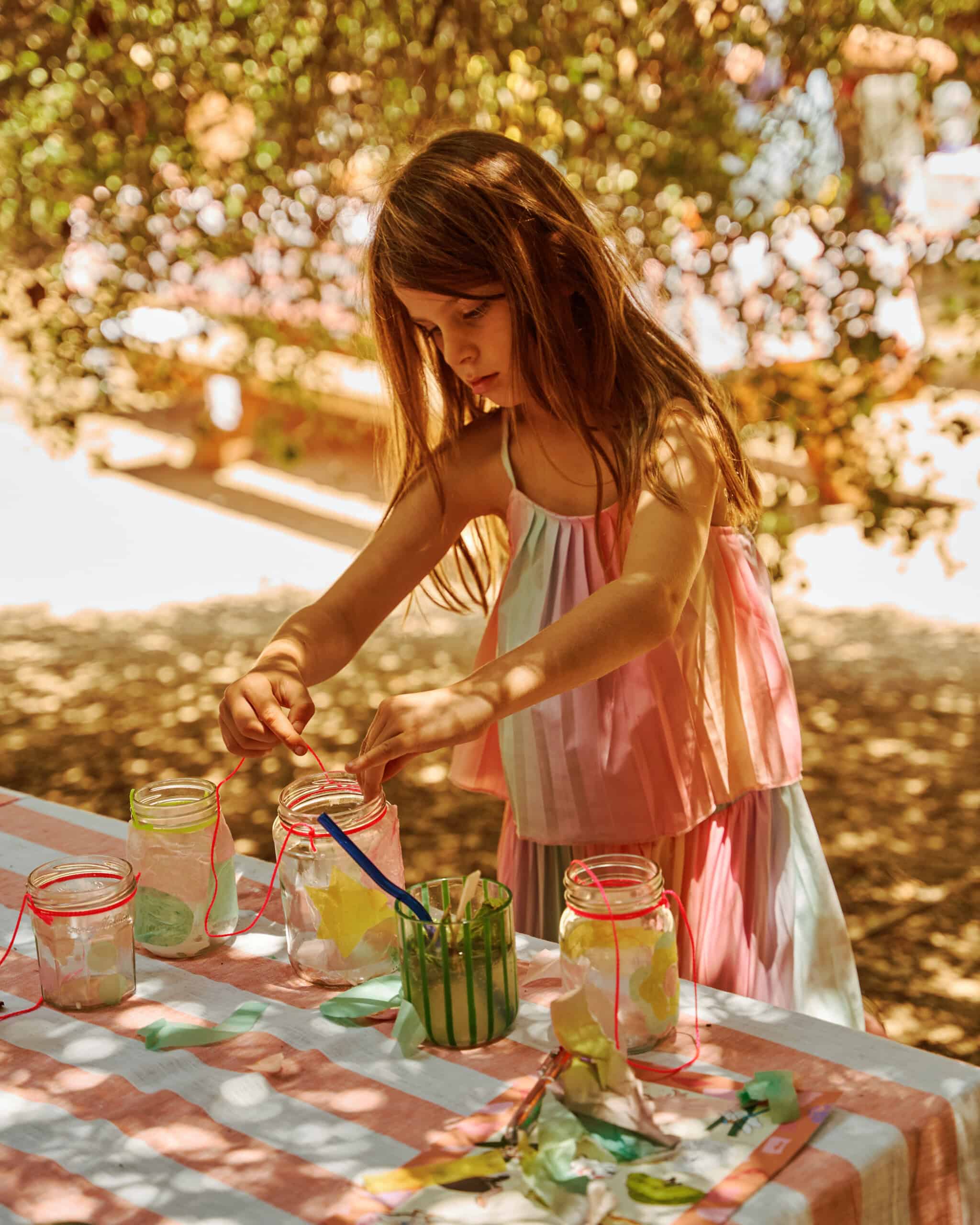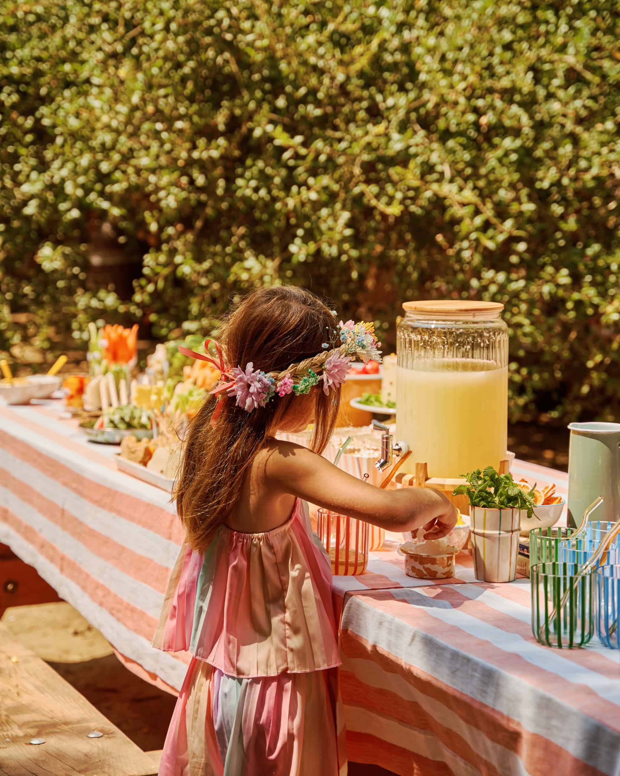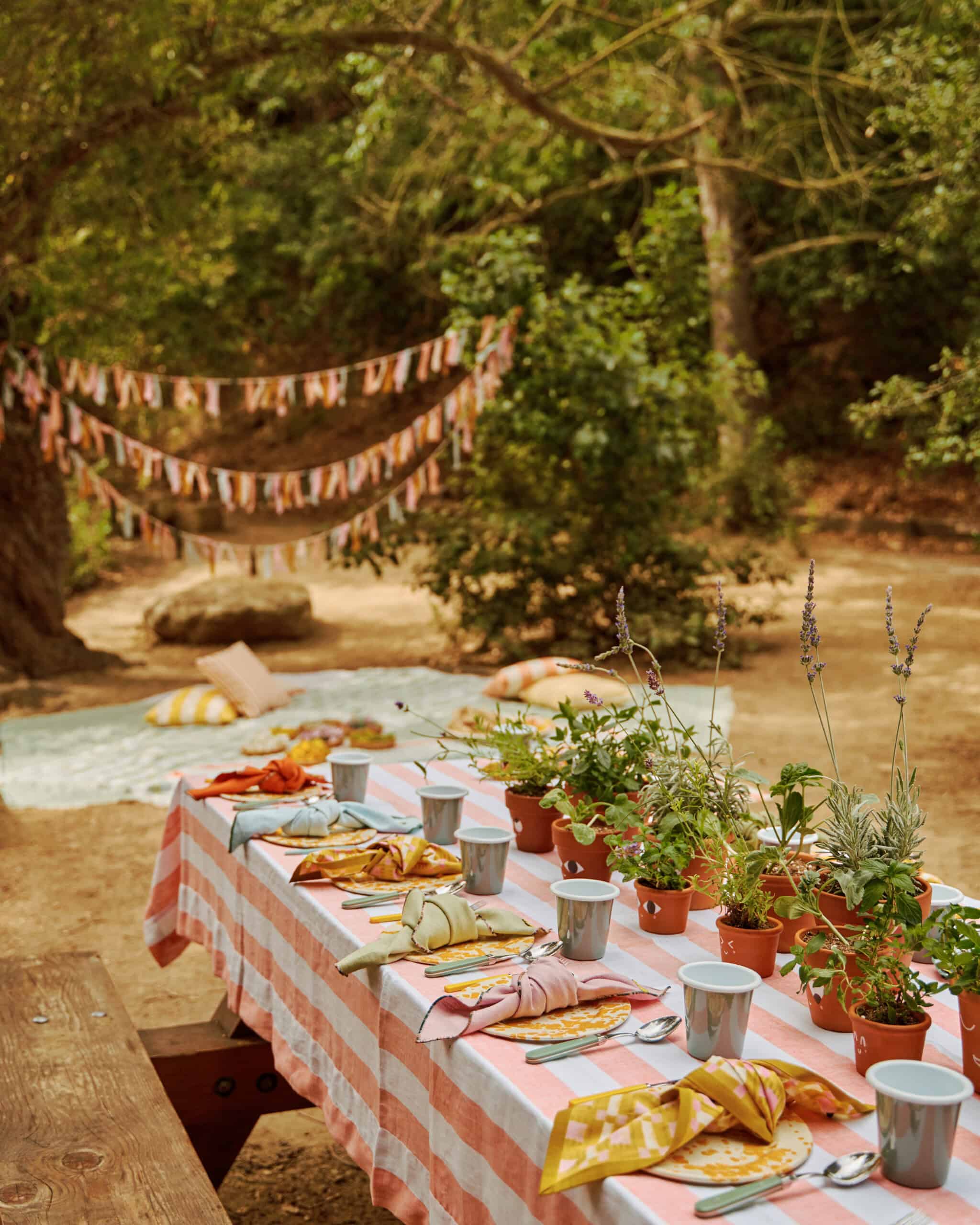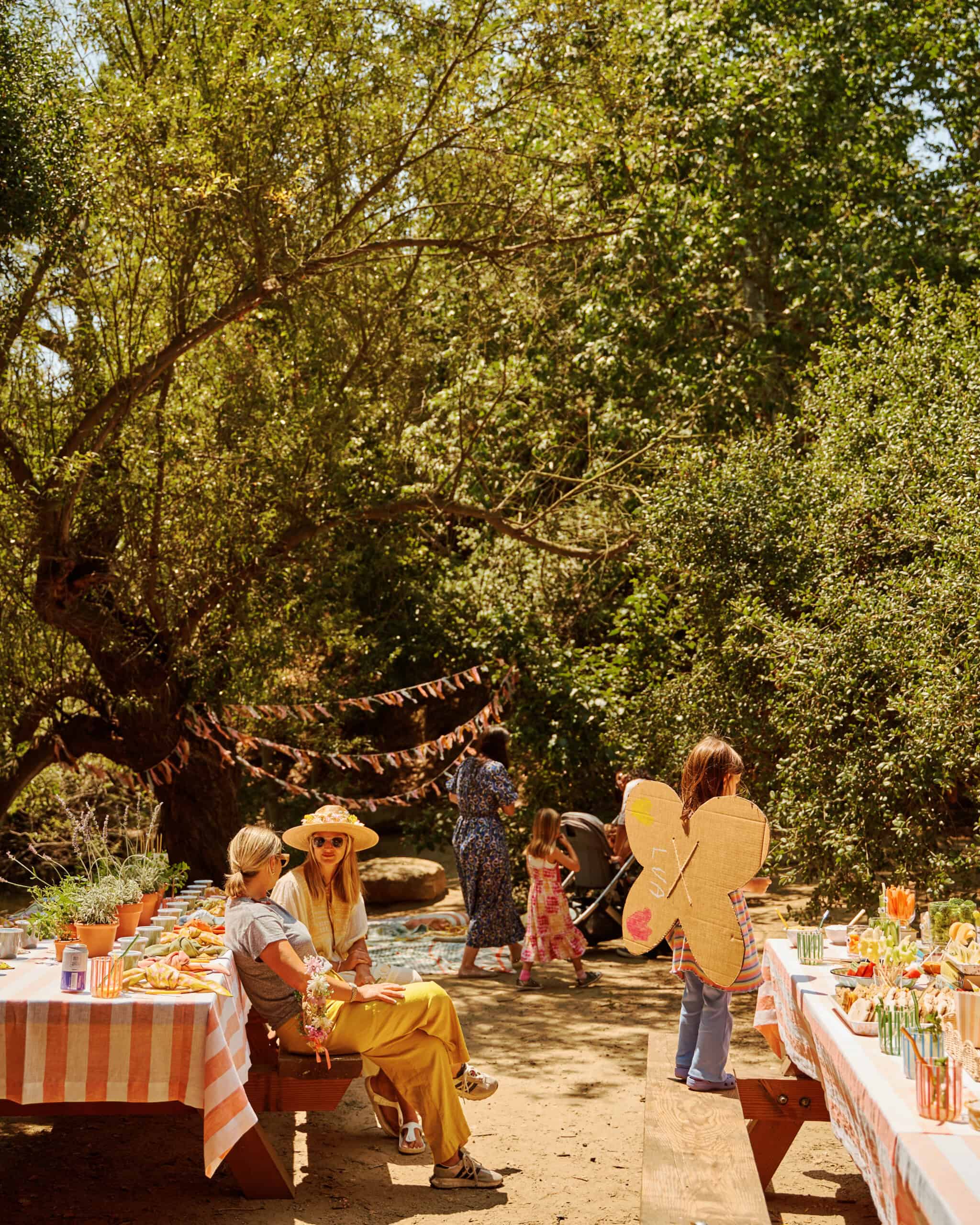 When stylist Catherine Dash set out to plan her daughter Coco’s sixth birthday, she had a clear vision: something vibrant, personal, and rooted in nature—with as little plastic and party waste as possible. The result was a cheerful, low-impact celebration co-hosted with outdoor education program HAWKs, set beneath the trees of Franklin Canyon Park. With bright enamelware table settings, hand-painted plant favors, and nature-inspired crafts scattered throughout the shady grove, the party felt equal parts whimsical and grounded.