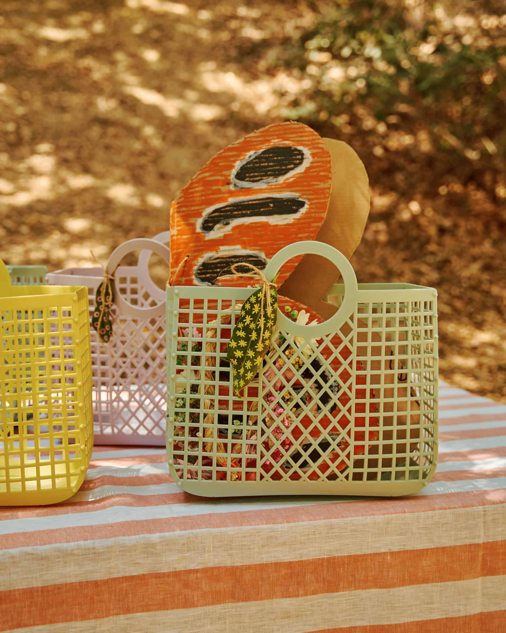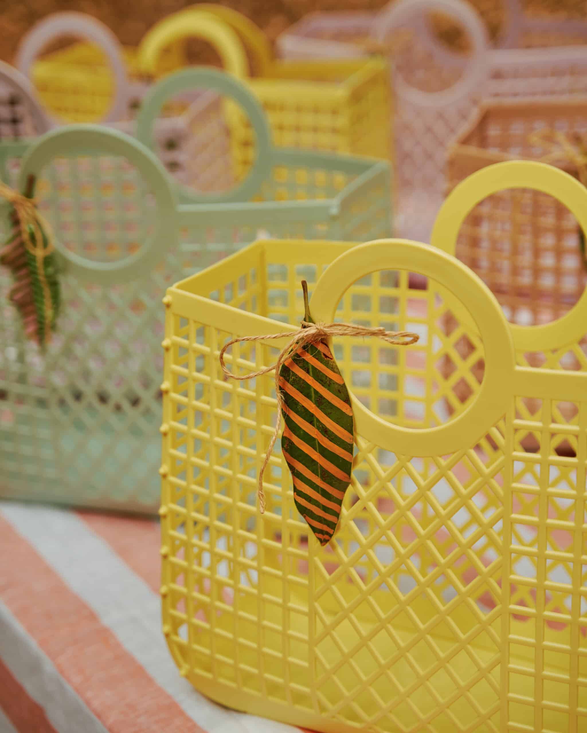 "In lieu of the standard-issue party favor goodie bag, we found these chic, recycled-plastic totes that were big enough to house a potted plant (from our table decor) plus all the crafts our guests made at the party, and did double duty as a gift in and of themselves."