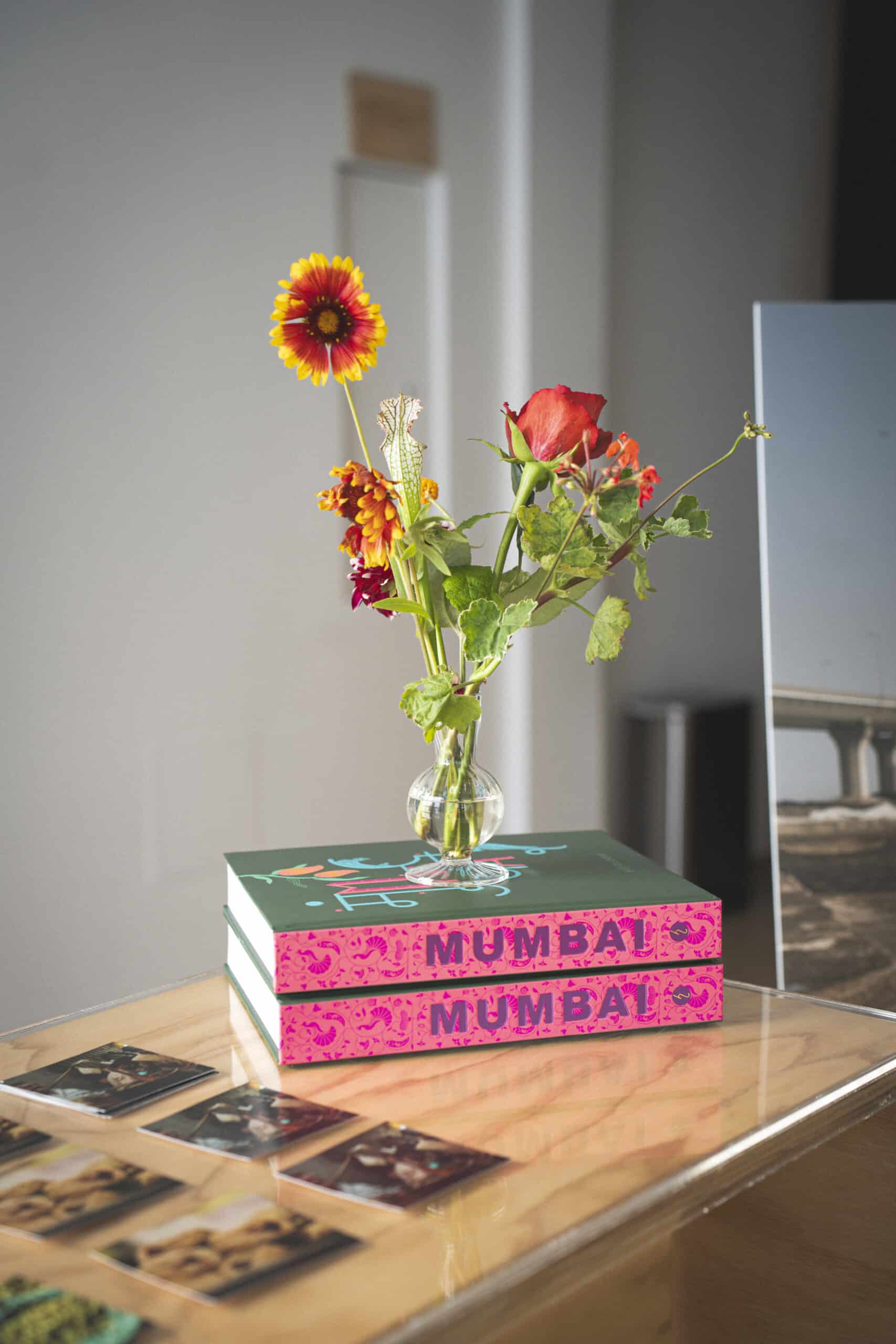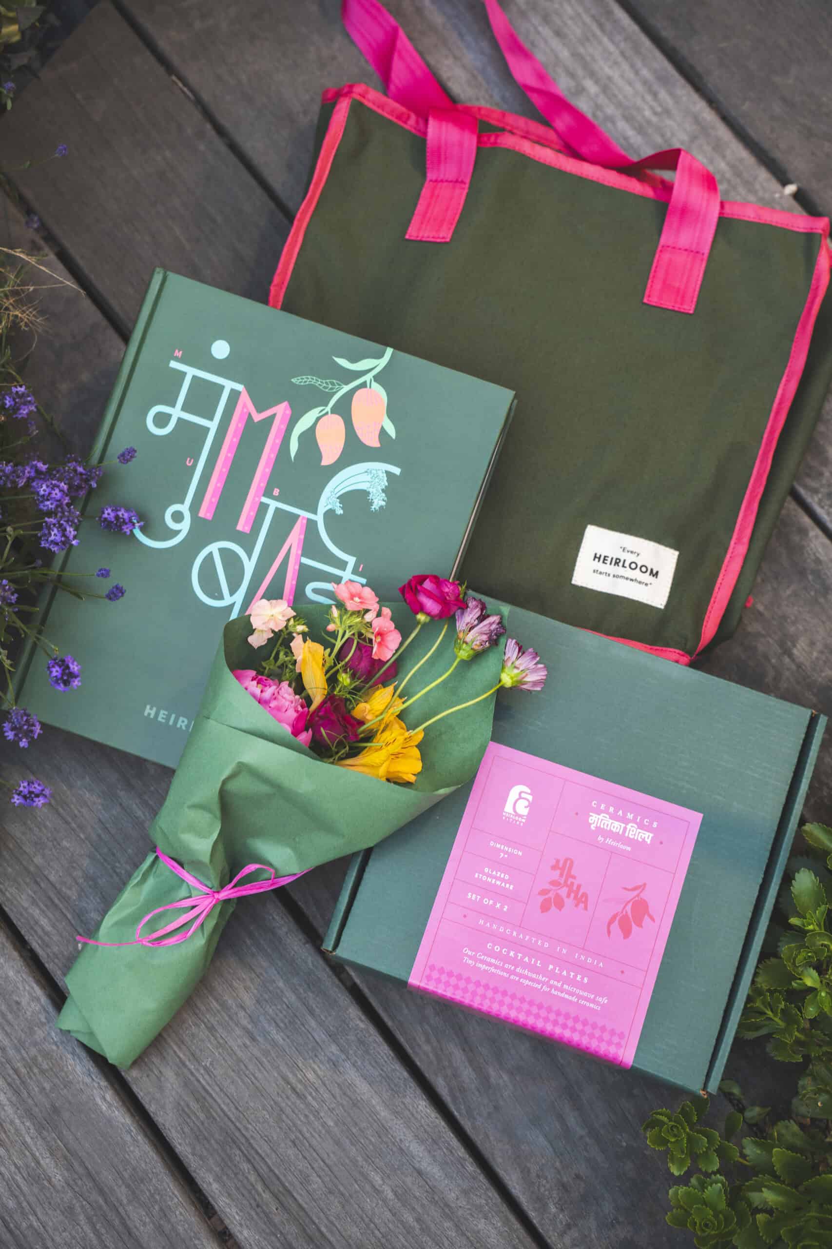 A copy of Heirloom Cities: Mumbai, a set of handmade ceramic plates from India, and mini bouquets from Natalie B. Designs.