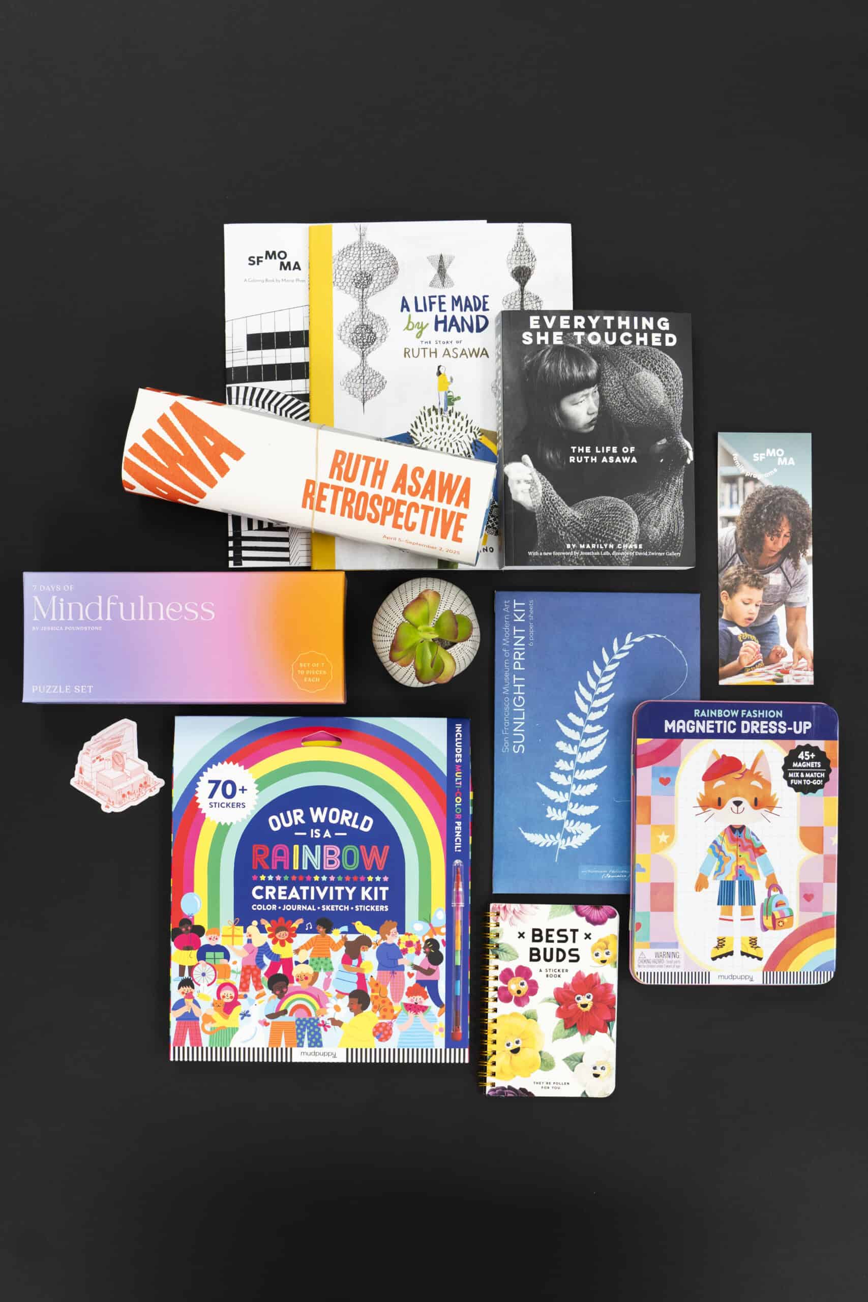- A little peek inside of our gift bags: A Life Made By Hand: The Story of Ruth Asawa by Andrea D'aquino, Everything She Touched: The Life of Ruth Asawa by Marilyn Chase, a Sunlight Print Kit, Ruth Asawa coloring sheets, and poster by SFMOMA, a Rainbow Fashion Magnetic Playset and Our World is a Rainbow Creativity Kit by Mudpuppy, Best Buds Googly Sticker Book by Brass Monkey, 7 Days Of Mindfulness Puzzle by Galison and Jessica Poundstone, and a Ruth Asawa-inspired vase, and succulent clipping from her garden.